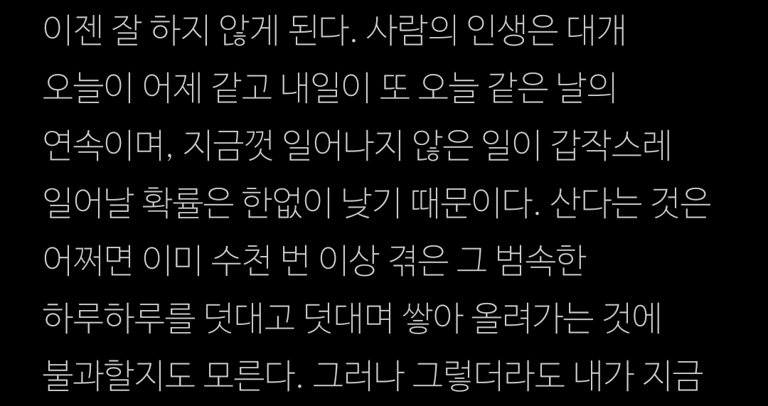 (전략) 사람의 인생은 대개 오늘이 어제 같고 내일이 또 오늘 같은 날의 연속이며, 지금껏 일어나지 않은 일이 갑작스레 일어날 확률은 한없이 낮기 때문이다. 산다는 것은 어쩌면 이미 수천 번 이상 겪은 그 범속한 하루하루를 덧대고 덧대며 쌓아 올려가는 것에 불과할지도 모른다. (후략)