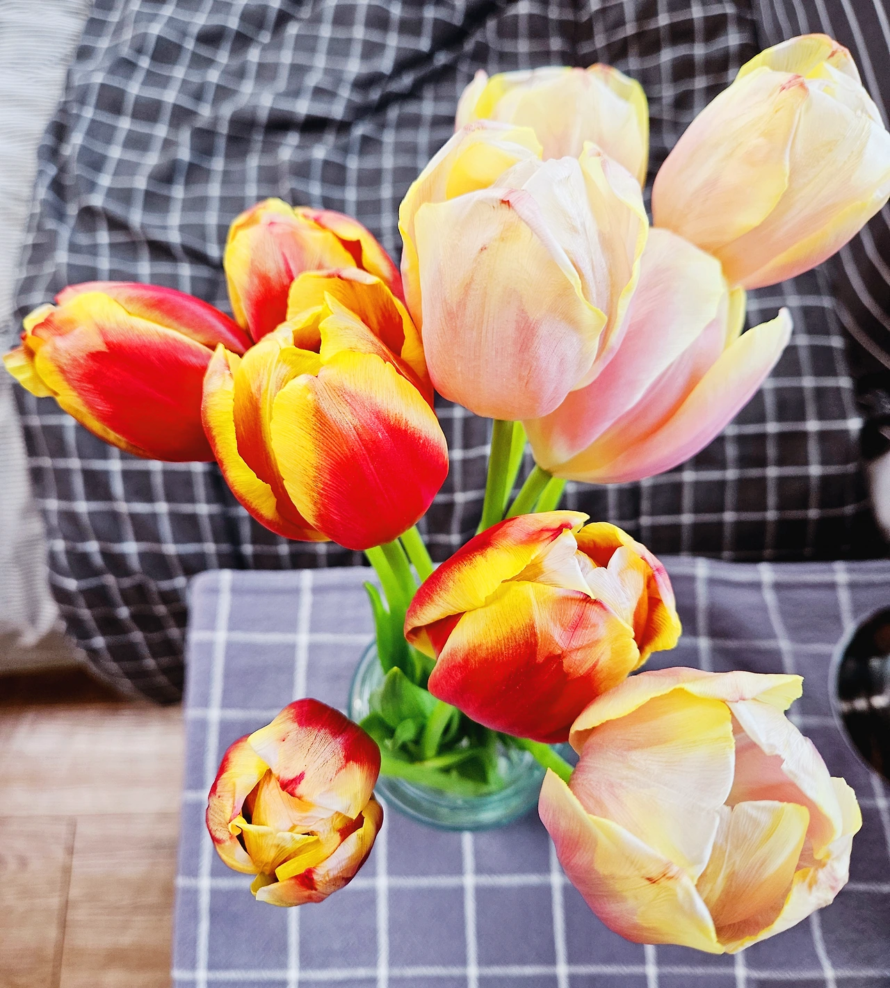 일주일이 넘어가면서 자꾸만 눕는 튤립들이 생겨서, 오늘 아침에는 길게 남겨두었던 줄기를 3분의 1 정도 바싹 잘라내고 남아있는 잎들도 한 번 더 정리를 했다. 그랬더니 또 나름 거천할 몸집이 가벼워진 탓인지 스무 송이 모두가 꿋꿋하게 제 자리를 잘 키키고 있다. 아무래도 생기는 처음 꽃이 피기 시작할 때만은 못하고 몇몇 송이는 꽃잎 끝부터 조금씩 말라가고는 있지만 그래도 이번 주말 정도까지는 잘 버티지 않을까도 싶다. 이 정도면 배송 온 후 열흘 조금 넘게 버티는 셈이고, 썩 훌륭한 성적이다.