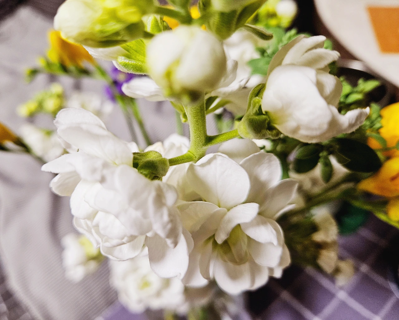후임으로 산 것은 판매 옵션이 무려 '제철 꽃다발'이라 내심 어떤 꽃들이 오려는지 몹시 궁금했다. 아는 꽃을 기다리는 것도 물론 반갑지만 이렇듯 '랜덤'을 주문해 놓고 어떤 꽃이 오는지를 기다리는 것에는 또 나름의 재미가 있는 법이다. 이번에 온 꽃은 흰색과 보라색의 스타티스와 흰 스토크, 그리고 벌써 나온 프리지아가 섞여 있었고 나름 '센터'로 거베라 한 송이가 들어 있었다.