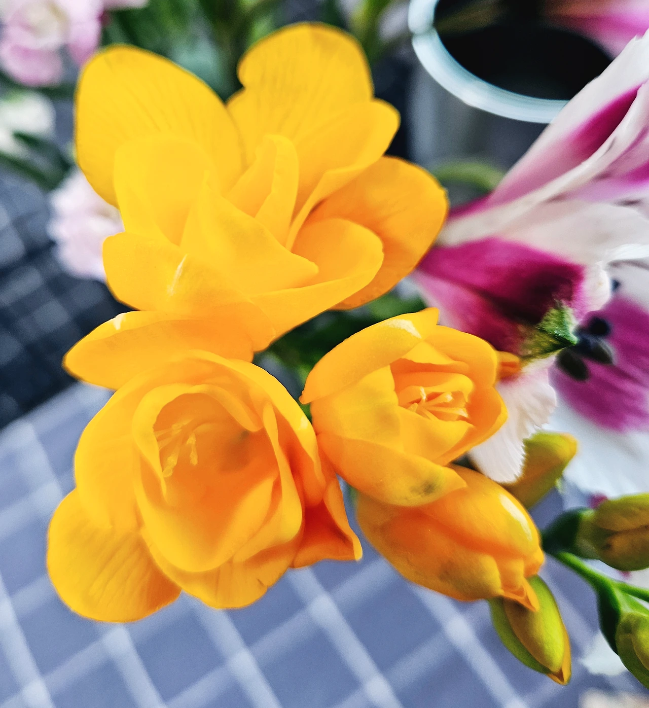 일전에 한 번 그의 봉안당에서 집에서 애면글면 물을 갈아주는 것보다 훨씬 더 예쁘게 핀 프리지아를 보고 마음이 상한 이야기를 쓴 적이 있다. 사흘 전쯤 새로 주문한 유찰꽃을 받아 줄기를 다듬으면서, 불쑥 혹시나 프리지아도 줄기 끝을 사선이 아니라 일자로 잘라주면 좀 오래가지 않을까 하는 생각을 했다. 그래서 줄기가 단단한 장미는 빼고, 알스트로메리아부터 프리지아까지 온 꽃들 대부분을 다 줄기를 사신이 아닌 일자로 잘랐다. 그리고 우연인지 뭔지 모르겠지만, 그 후로 프리지아는 지금껏 집에 가져다 놓은 프리지아 중에 제일 아름답게 피고 있는 중이긴 하다.