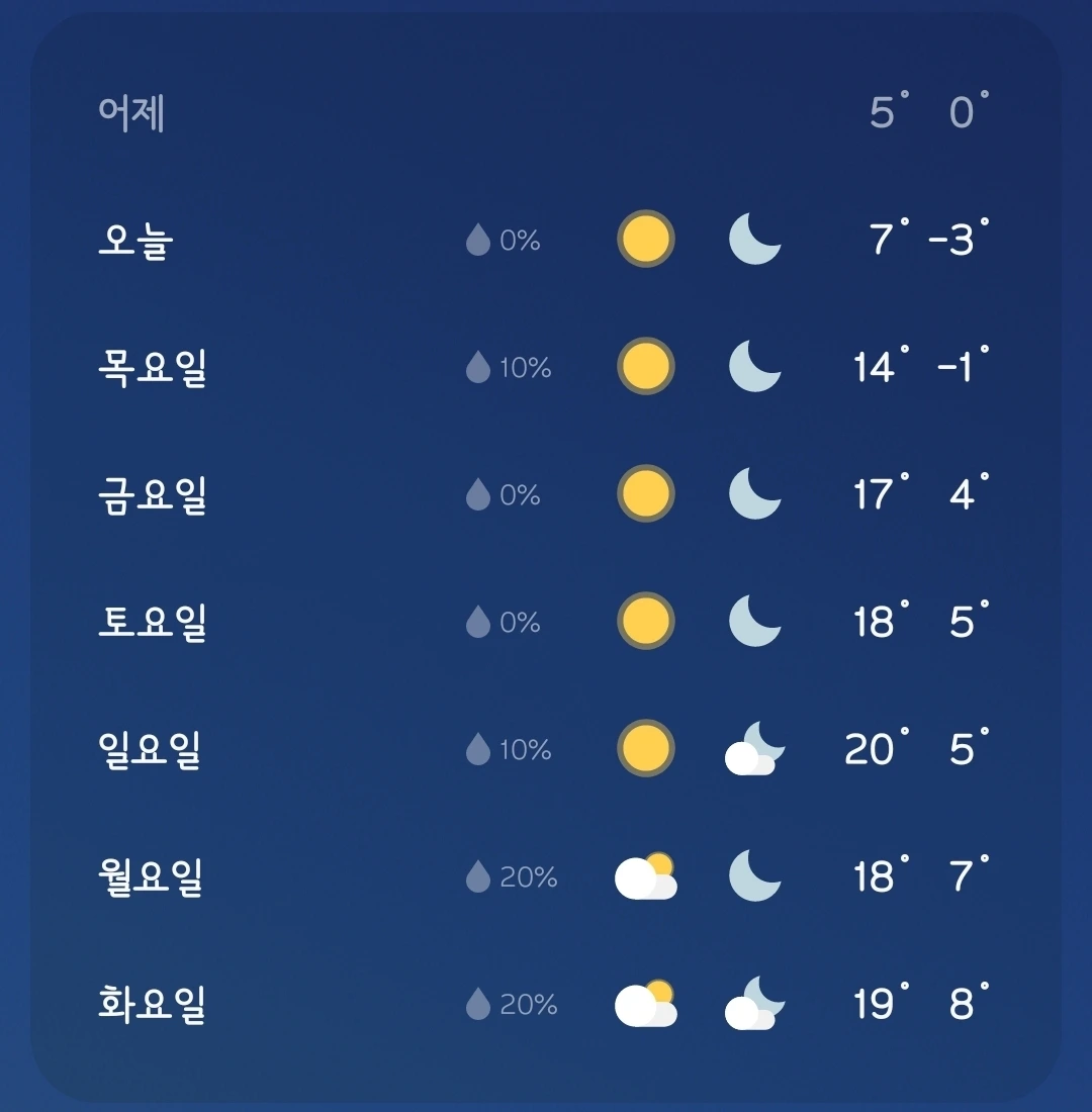 그러나 그러던 것도 어제까지인 모양이다. 기온상으로는 어제까지도 날이 쌀쌀하다곤 했지만 창 밖으로 비치는 바깥의 풍경이 이미 어제의 눈발 날리던 풍경과는 달랐다. 저녁 무렵 잠깐 편의점에 다녀오느라 바깥에 나갔다 와 보니 아직 덜 풀린 날씨가 쌀쌀하긴 했지만 눈발 날리던 그제의 기세와는 역시 비교할 수가 없어서 어쩔 수 없이 이번 겨울도 이렇게 물러가는구나 하는 생각을 하게 했다. 다음 주 월요일 미팅에 갈 때쯤엔 옷 걱정을 안 해도 되려나 하고 핸드폰을 들여다보니 일요일 최고 온도가 20도에 육박해 있어서 너도 모르게 고개를 절레절레 내저었다. 이 정도면 이건 봄 날씨도 아니고 초여름 날씨가 아닌지. 정말로 올해는 4월부터 여름이 되려는가 싶기도 했다.