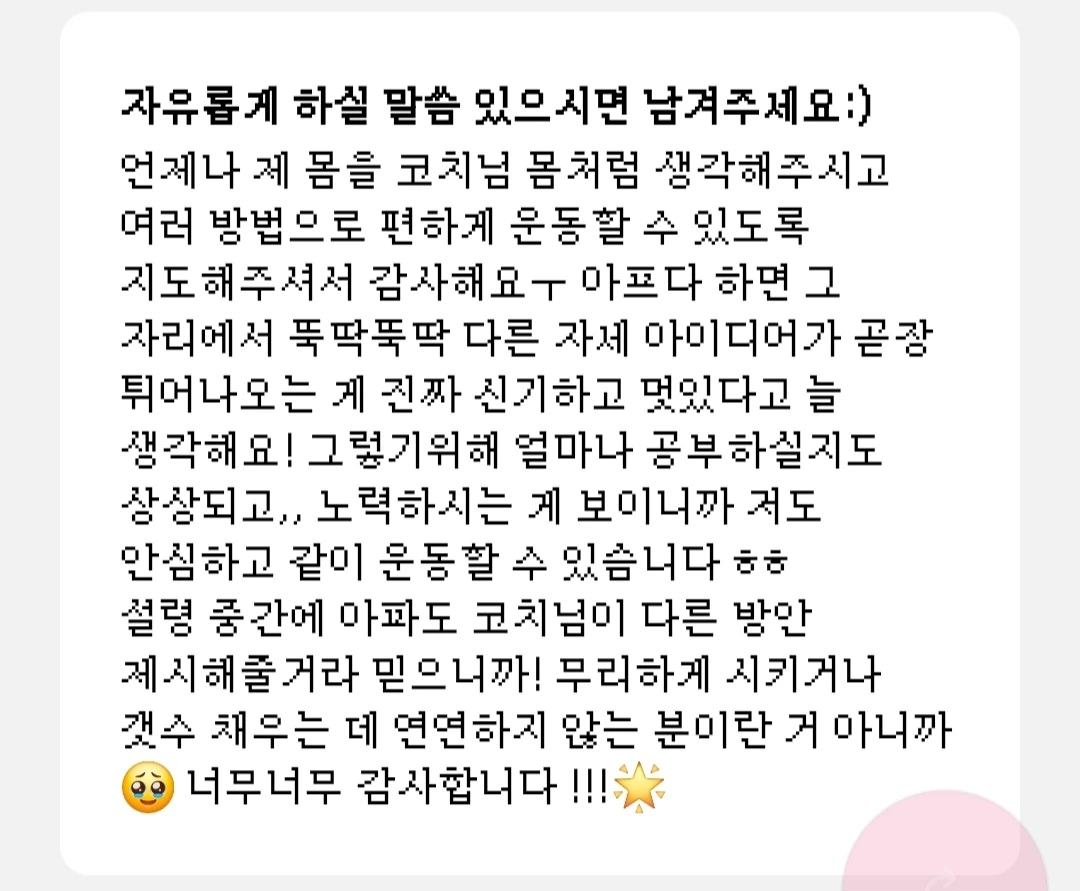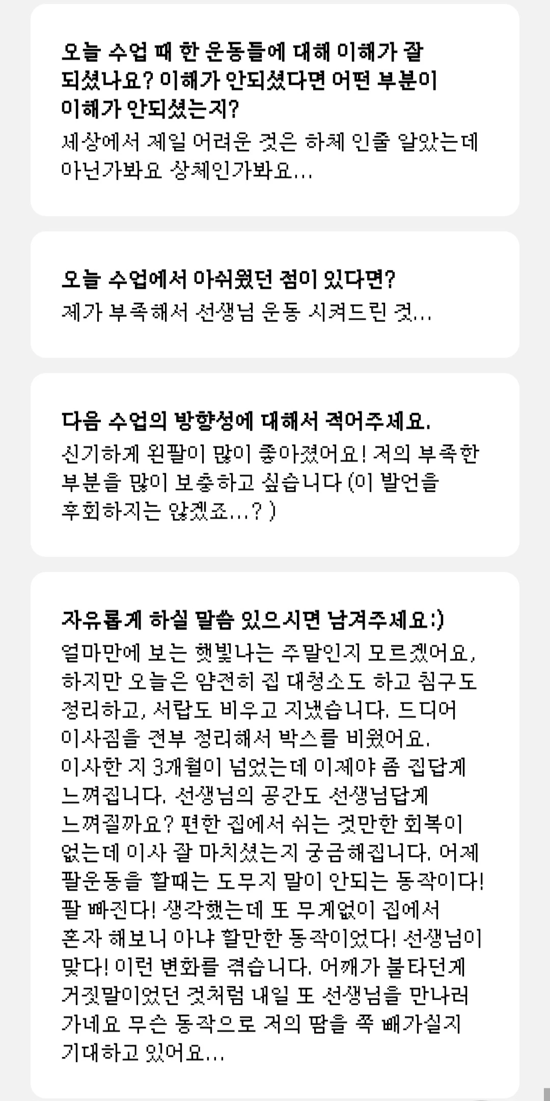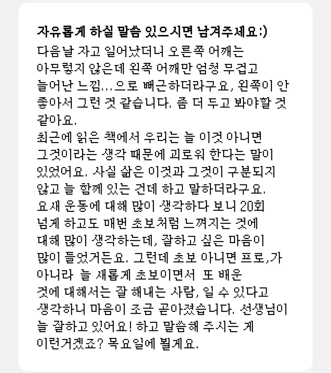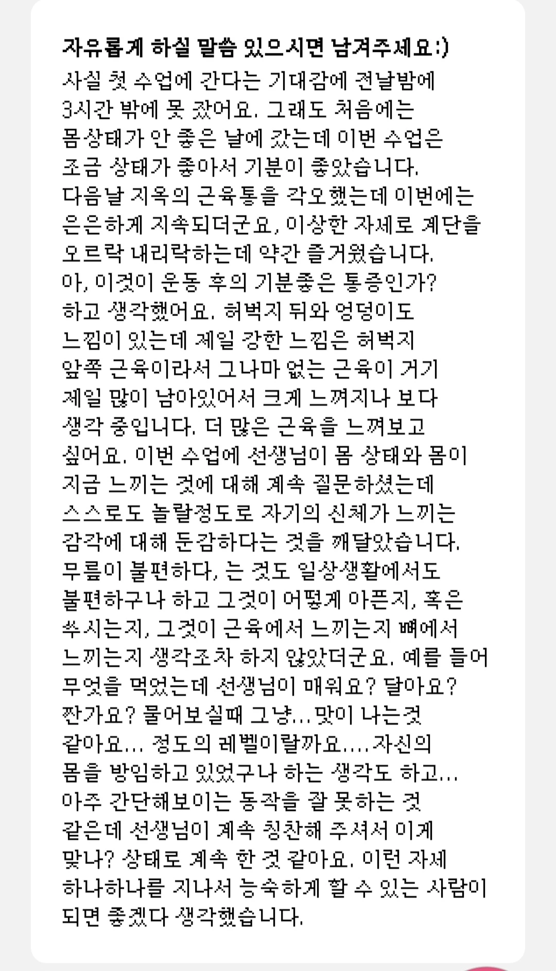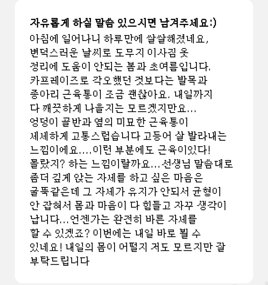 회원님들의 설문지를 체크하다 보면, 은근히 기대되는 설문지가 몇 개 있다. 그 중, 월요일과 목요일 오후 3시, 한결같은 시간에 수업을 받으시는 회원님이 계시다. 평소엔 말수가 크게 없으시지만 매번 엄청난 필력으로 설문지를 꽉꽉 채워 제출해주신다. 이분의 첫 설문지를 받았을 때가 아직도 생생하게 마음에 남는다.