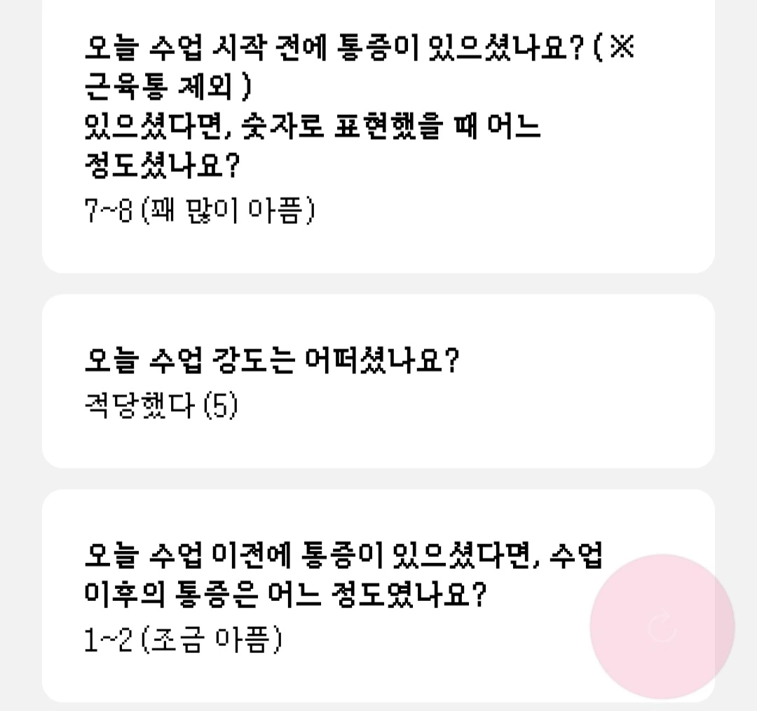 설문지에는 회원님의 운동 전·후 컨디션, 운동 전·후 통증 강도, 운동 강도, 이해가 안 됐던 부분, 아쉬웠던 점, 다음 수업의 방향성, 그리고 자유롭게 남기는 란이 있다.
