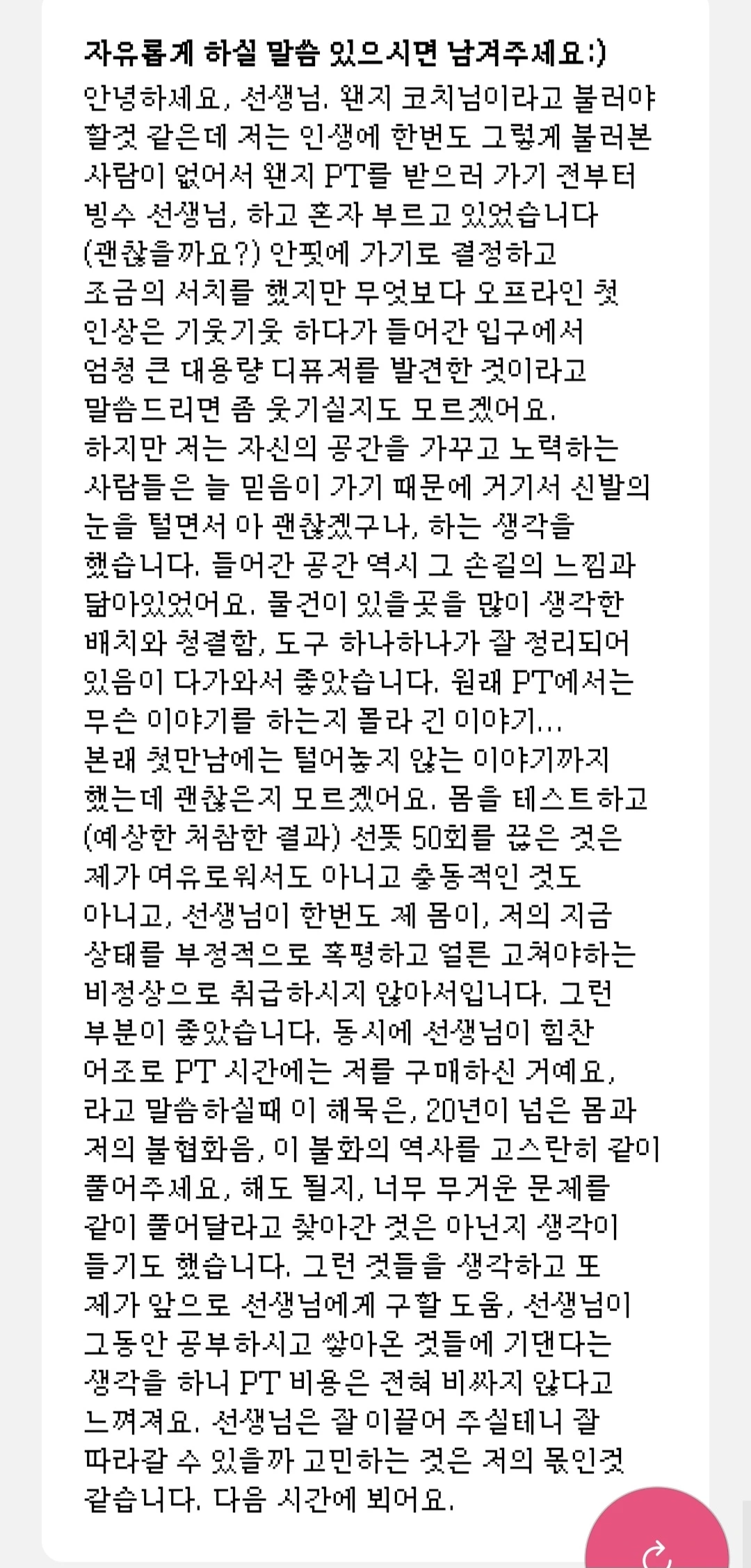 안녕하세요, 선생님. 왠지 코치님이라고 불러야 할것 같은데 저는 인생에 한번도 그렇게 불러본 사람이 없어서 왠지 PT를 받으러 가기 전부터 빙수 선생님, 하고 혼자 부르고 있었습니다 (괜찮을까요?) 안핏에 가기로 결정하고 조금의 서치를 했지만 무엇보다 오프라인 첫 인상은 기웃기웃 하다가 들어간 입구에서 엄청 큰 대용량 디퓨저를 발견한 것이라고 말씀드리면 좀 웃기실지도 모르겠어요. 하지만 저는 자신의 공간을 가꾸고 노력하는 사람들은 늘 믿음이 가기 때문에 거기서 신발의 눈을 털면서 아 괜찮겠구나, 하는 생각을 했습니다. 들어간 공간 역시 그 손길의 느낌과 닮아있었어요. 물건이 있을곳을 많이 생각한 배치와 청결함, 도구 하나하나가 잘 정리되어 있음이 다가와서 좋았습니다. 원래 PT에서는 무슨 이야기를 하는지 몰라 긴 이야기... 본래 첫만남에는 털어놓지 않는 이야기까지 했는데 괜찮은지 모르겠어요. 몸을 테스트하고 (예상한 처참한 결과) 선뜻 50회를 끊은 것은 제가 여유로워서도 아니고 충동적인 것도 아니고, 선생님이 한번도 제 몸이, 저의 지금 상태를 부정적으로 혹평하고 얼른 고쳐야하는 비정상으로 취급하시지 않아서입니다. 그런 부분이 좋았습니다. 동시에 선생님이 힘찬 어조로 PT 시간에는 저를 구매하신 거예요, 라고 말씀하실때 이 해묵은, 20년이 넘은 몸과 저의 불협화음, 이 불화의 역사를 고스란히 같이 풀어주세요, 해도 될지, 너무 무거운 문제를 같이 풀어달라고 찾아간 것은 아닌지 생각이 들기도 했습니다. 그런 것들을 생각하고 또 제가 앞으로 선생님에게 구할 도움, 선생님이 그동안 공부하시고 쌓아온 것들에 기댄다는 생각을 하니 PT 비용은 전혀 비싸지 않다고 느껴져요. 선생님은 잘 이끌어 주실테니 잘 따라갈 수 있을까 고민하는 것은 저의 몫인것 같습니다. 다음 시간에 뵈어요.