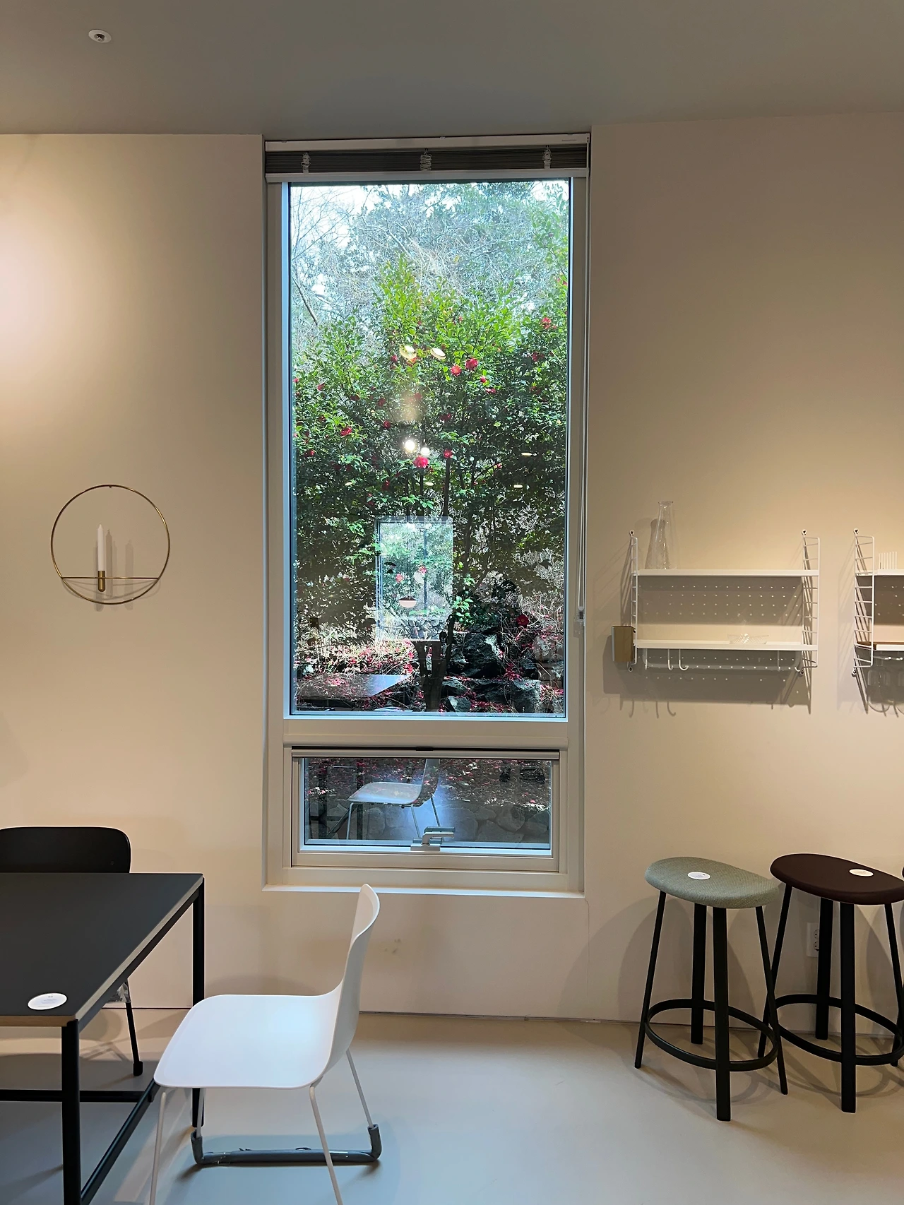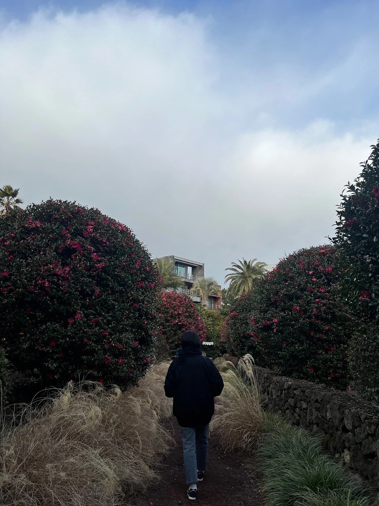 공간이 많이 나누어져 있는 갤러리 같은 느낌의 카페에서 꽈배기와 커피를 마시면서 창밖에 흩날리는 눈을 바라봤다. 동백꽃이 있는 정원이 있어서 잠시 담소를 나누고 정원 탐방을 했다.