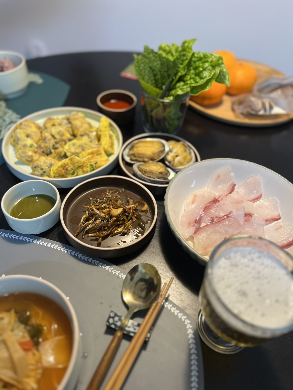 어제 피곤해서 저녁을 대충 먹어서 오늘은 제대로 먹기로 했다. 콩나물국, 전복구이, 회, 굴전 등 냉장고에 있는 음식들도 이제는 다 정리해야 해서 나름의 만찬을 준비했다. 벌써 한 달이 다 되다니~ 너무 아쉽다. 아쉬운 마음을 언니와 나누면서 제주 온 지 30일이 되는 밤을 보낸다.