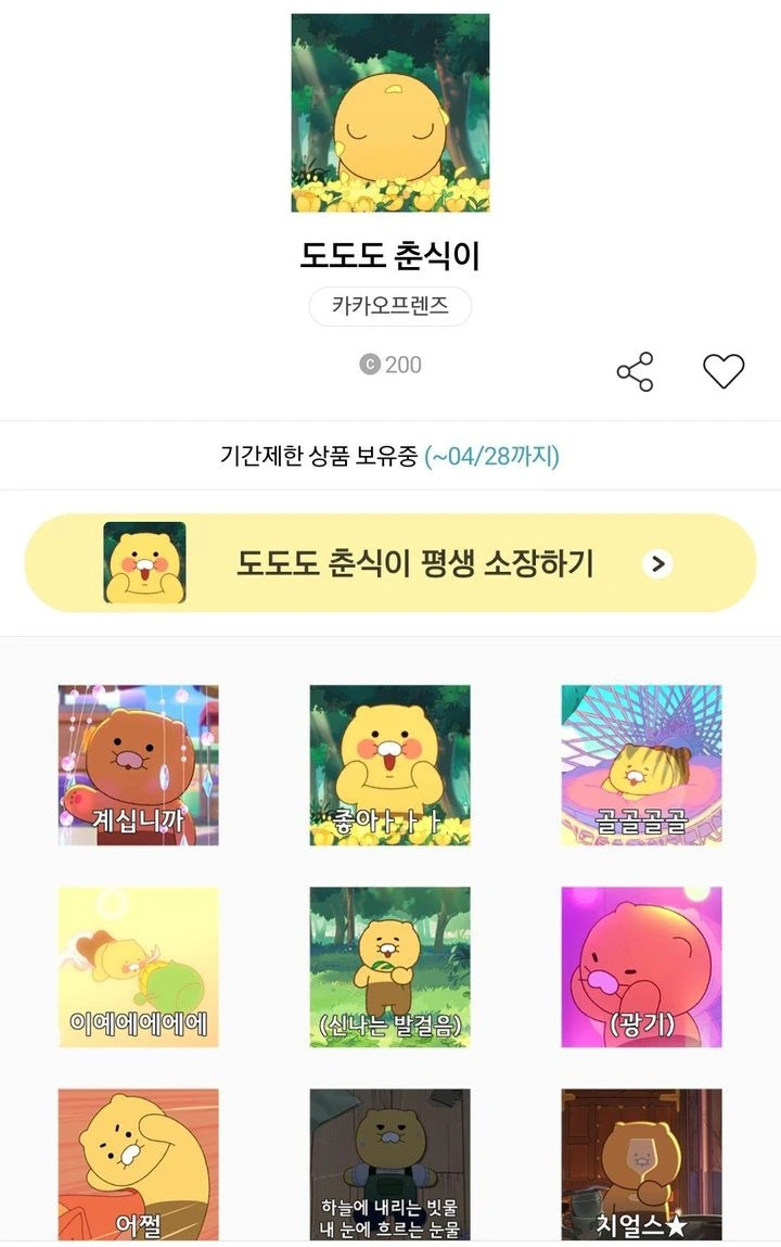 그렇게 알게 된 이모티콘을 혼자만 알기에는 아까워, 가족 단톡방에 올렸다. <도도도 춘식이> 이모티콘을 올리자마자 아이는 1분 안에 다운을 받았다. 너무 빨리 다운로드하여 새삼 MZ세대의 속도에 감탄했다. 평소 그렇게 알게 된 공짜 이모티콘도 공유하지 않는 남편은 내가 선물한 이모티콘에 반응이 없었다.