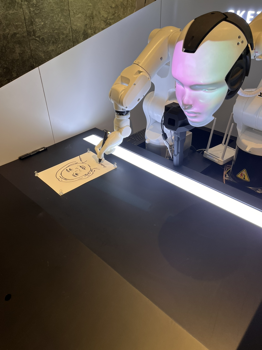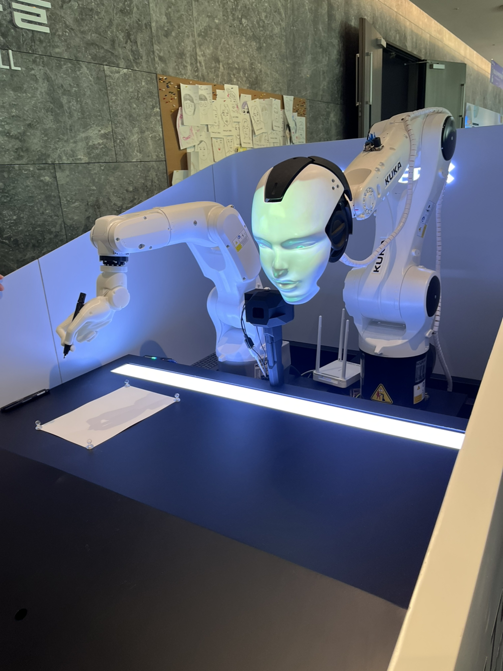 자리에 앉아 정면에 보이는, 로봇의 오른손과 얼굴 사이에 있는 카메라 렌즈를 바라았다. 안경을 맞추듯 고개를 조금 올려보세요.라는 안내받았다. 됐다는 신호와 함께 자리에 일어나 로봇이 그리는 내 얼굴을 바라보았다. 완성된 그림 속의 사람은 내가 아니었다. 얼굴은 넙데데했고, 모자를 인식하지 못해 바가지를 씌워 놓은 듯 어색했다.