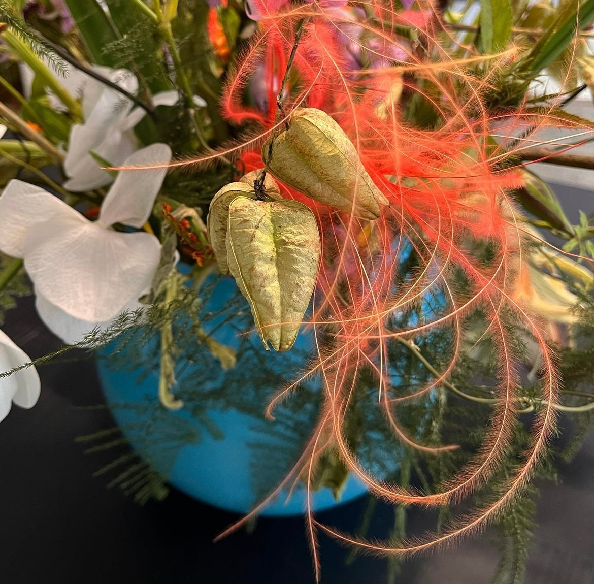 연출한 것인데 인위적이지 않아 감탄했다. 우리가 앉은 테이블 위에도 꽃이 있었다. 초록 분수처럼, 솟아오르는 물줄기를 닮은 센터피스에는 주홍빛 앵두가 달려있었다. 이쯤 되니 다른 테이블의 꽃들도 궁금해졌다. 테이블마다 돌아다니며 꽃투어를 했다. 어떤 테이블을 거베라가 둥글게 모여 있는 디자인이었고, 어떤 테이블은 방울꽃이 종처럼 매달려 있었다. 테이블 아래에도 꽃이 놓여 있었는데, 자세히 들여다보니 그건 조화였다. 조화가 포함되어 있다는 걸 안 이후로는 모든 꽃을 의심하기 시작했다. 가운데 돌상에 놓인 꽃을 두고, 친구와 진짜인지 가짜인지 토론했다.