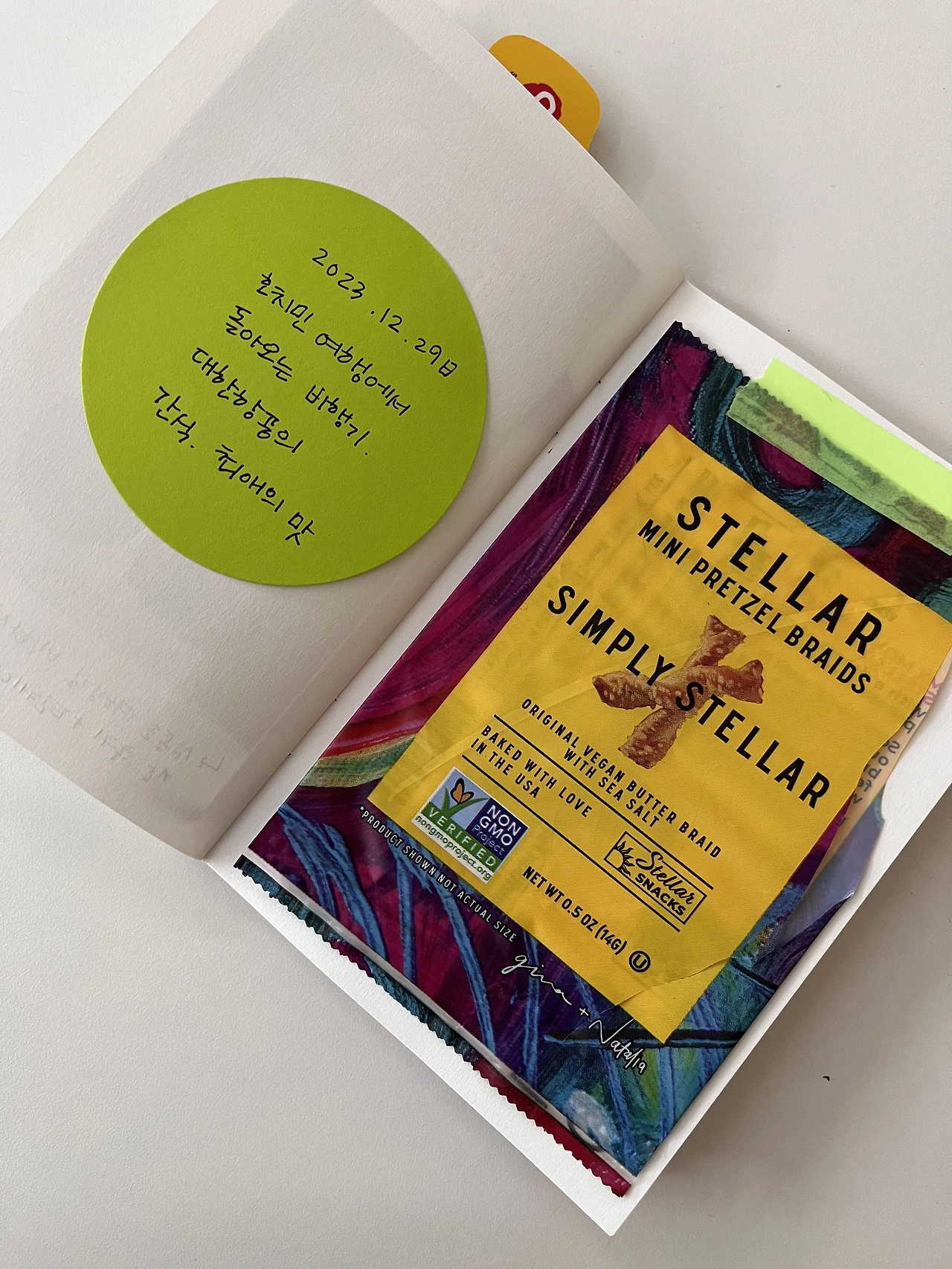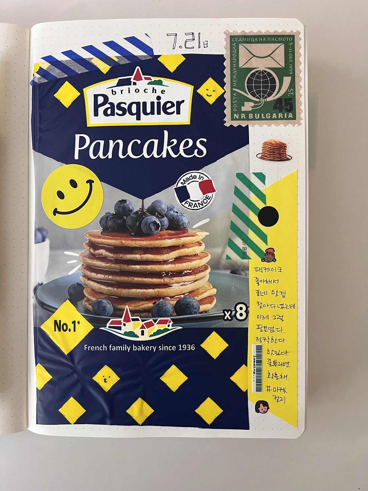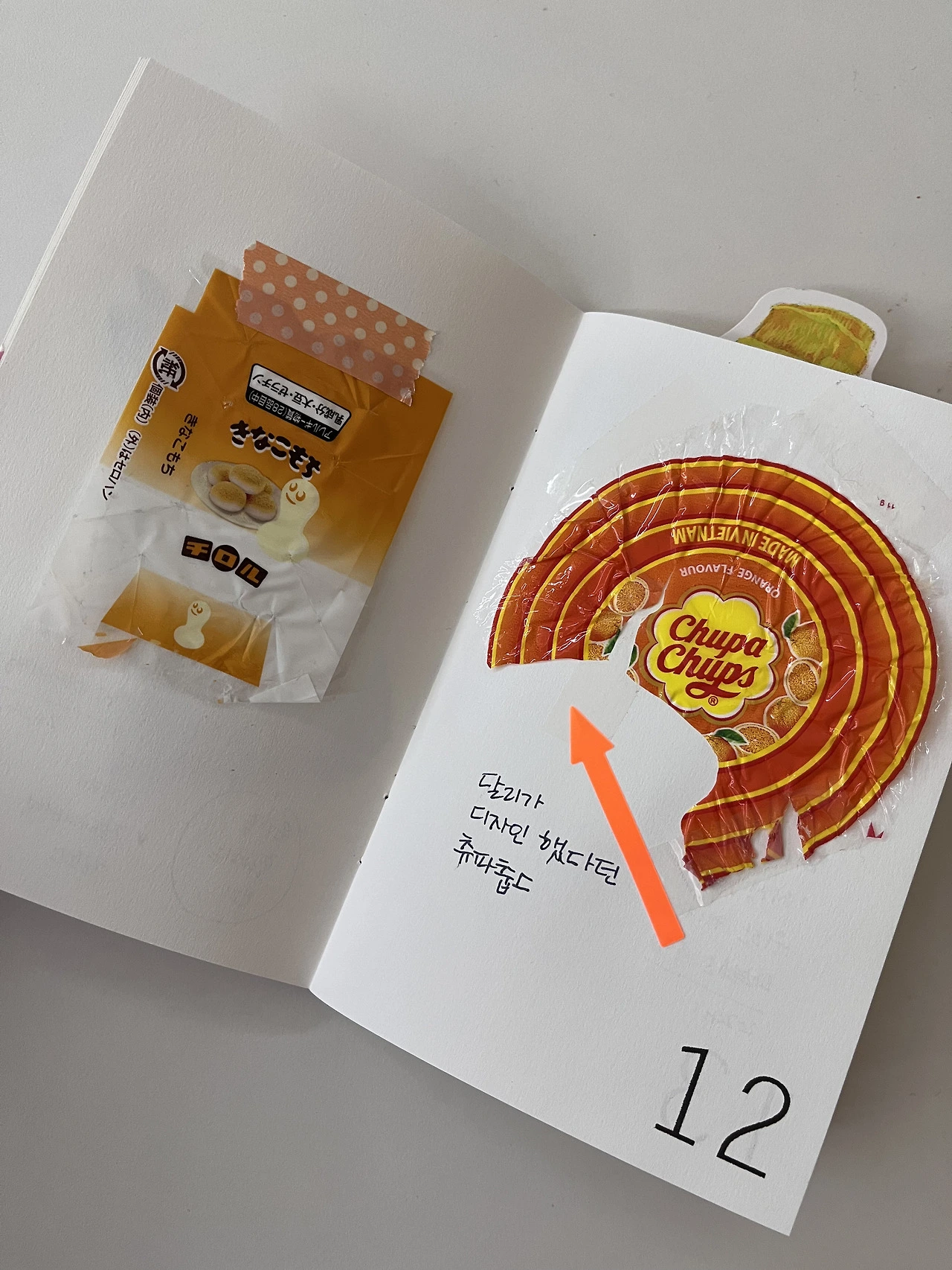 기내에서 받은 프레첼 봉지, 프랑스 초콜릿, 스웨덴 젤리, 일본 쿠키 등 패키지 디자인이 예뻐서 버리기 아까운 포장지들을 오려서 노트에 붙입니다. 작은 동그라미 스티커나 마스킹 테이프를 붙여서 꾸며 보세요. 한 장 한 장 붙이다 보면, 언제든 쭉 펼쳐볼 수 있는 두둑한 디저트 통장이 됩니다.