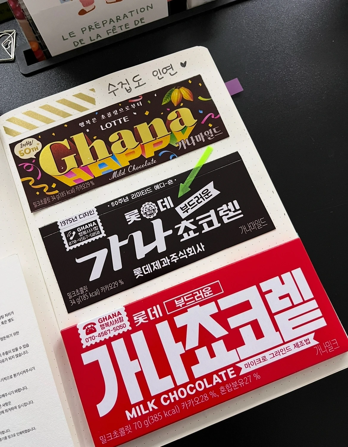 시간이 흐르면서 예쁜 것뿐 아니라, 의미 있는 디저트 포장지도 붙였습니다. 가나 초콜릿이 50주년 맞이하여 레트로 디자인을 출시하였습니다. 1975년, 1987년, 2002년의 디자인을 다시 만날 볼 수 있었죠. 지금은 볼 수 없는 삐삐(휴대전화 전의 기계)처럼, 그 시절의 감성을 담은 패키지가 정겨웠습니다. 무조건 예쁜 포장지만을 기록한다는 기준을 바꿀 만큼 매력적인 기획이었습니다. 그때부터 마트에 가면 눈을 크게 뜨고 가나 초콜릿을 찾았습니다. 있는 곳도 있었고, 없는 곳도 있어서 우연히 만나는 즐거움도 있었습니다. 하나면 쓰레기지만 두 개부터는 수집이 됩니다. 하나면 의미가 없지만 두 개부터는 의미가 생기기 시작합니다. 어느 날 살며시 가나 초콜릿 포장지 모으기 챌린지가 시작되었습니다. 그 후, 저의 기록을 응원이라도 하듯 <아틀리에 가나> 아트 컬렉션 5종이 한정판으로 출시되었습니다. 박선기, 김선우, 그라플렉스, 김미영, 코인 파킹 딜리버리 작가와 함께 아트 패키지가 탄생된 거죠. 작가의 작품을 컬렉팅 할 순 없어도(고가이므로) 초콜릿은 사 먹을 수 있었습니다. 그 덕분에 맛과 멋을 다 잡는 기록을 이어갈 수 있었습니다.