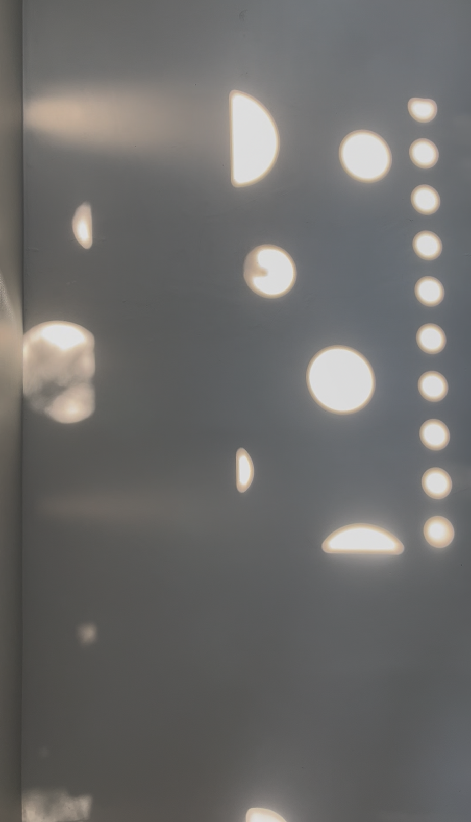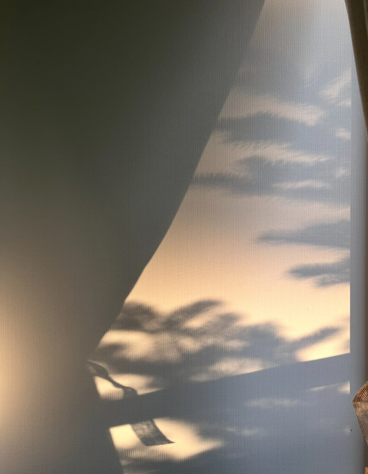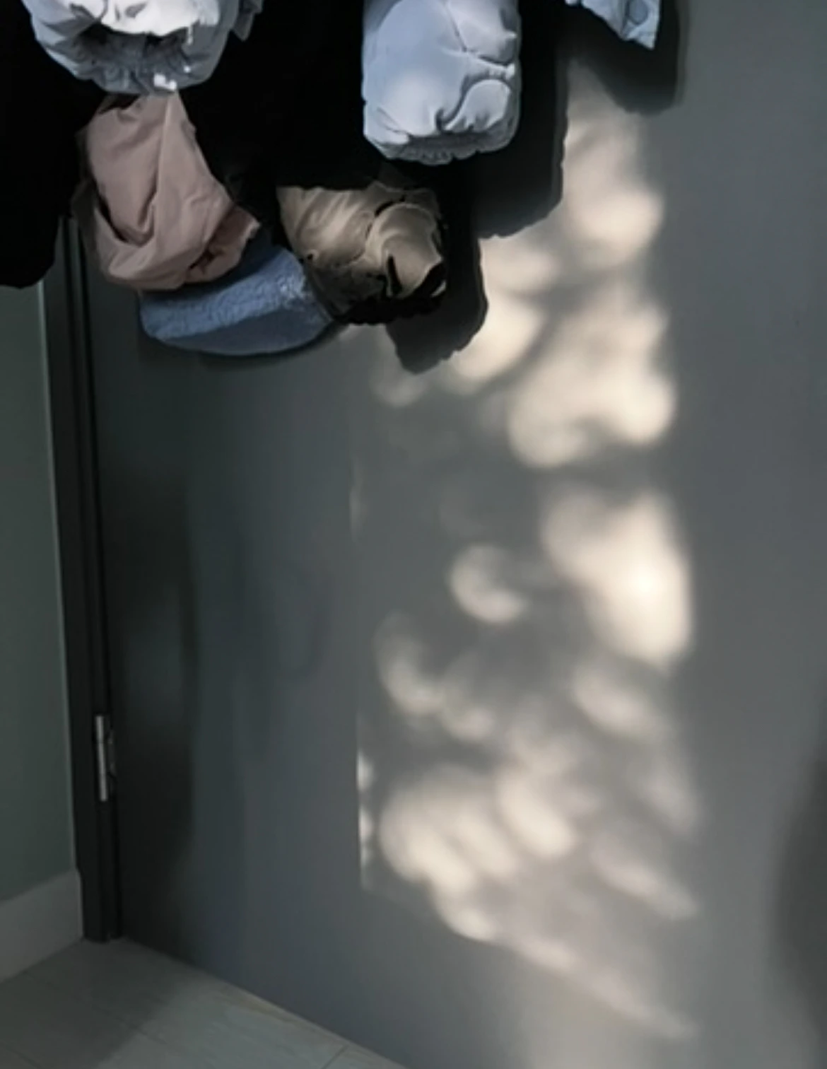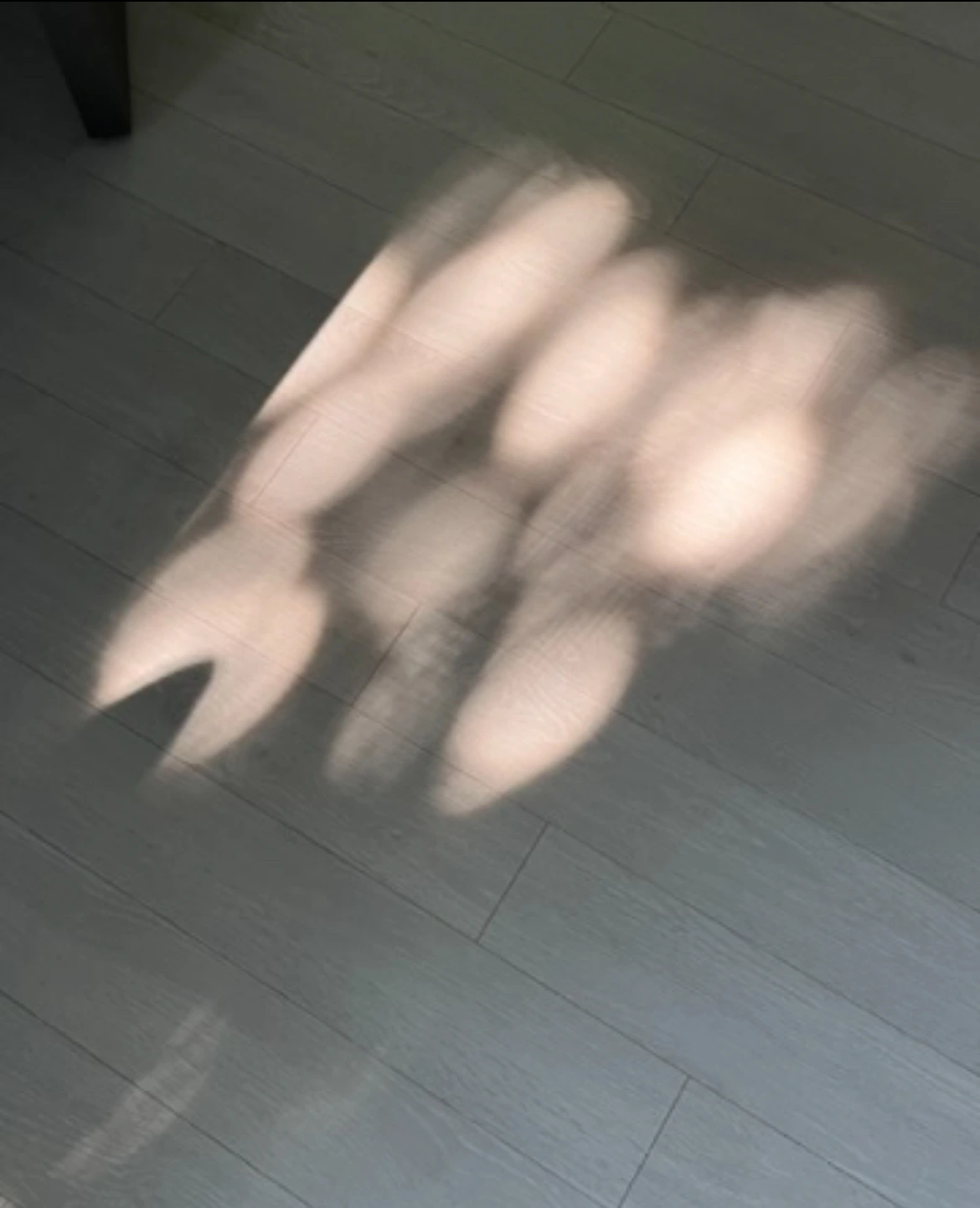 빛을 만난 순간들을 모아 기록했어요. 아침에 눈을 떴을 때, 방 천장에 다섯 개의 빛줄기가 먼저 와서 기다리고 있던 순간. 도서관을 나올 때, 귀여운 동그라미가 벽에 그림자로 새겨진 순간, 커튼에 비치는 화분의 이파리. 와인잔을 통과하며 여러 겹의 무지개 원이 생겼던 식탁 등. 빛과 그림자를 만나는 순간은 다양했습니다. 사진기록으로 모아놓고 보니 한 편의 서정시 같더군요. 그림자는 일상 속 메마른 감정을 촉촉하게 해 줍니다. 때로는 온몸을 나른하게 합니다.