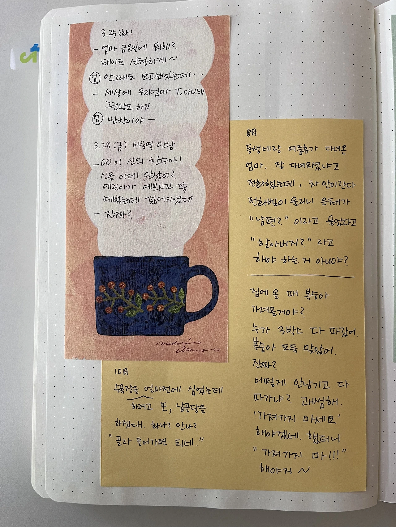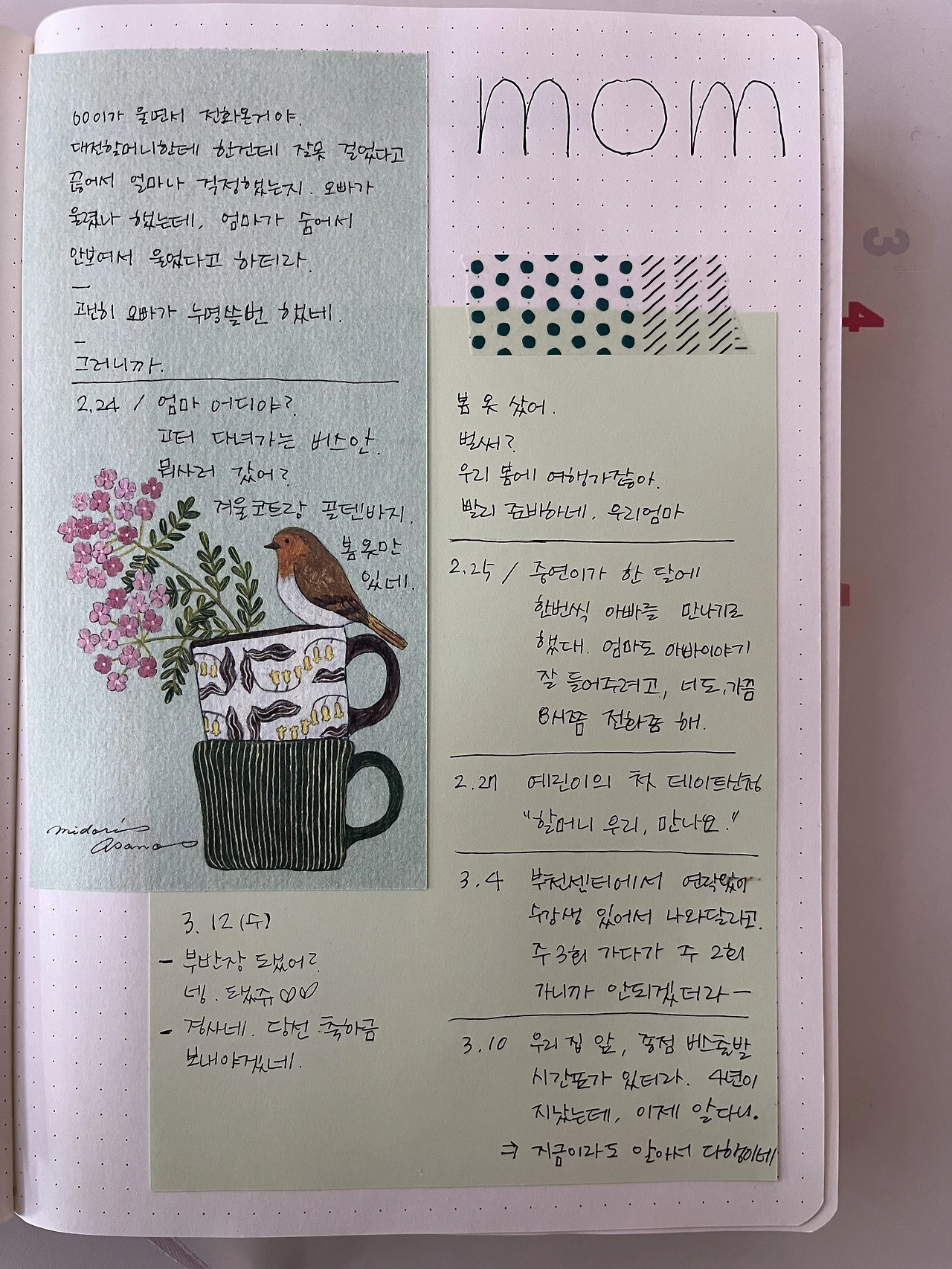 친구들과의 시간만 의미 있는 것은 아닙니다. 온 생애를 함께 한 부모와의 시간도 귀합니다. 엄마의 전화 통화를 기록하는 건 소중해서입니다. 동시에 엄마와의 시간이 유한하기 때문입니다. 여러분, 사랑하는 사람이 있나요? 그의 말을 귀 기울여 듣고, 마음 바구니에 담아 보세요. 그리고 노트 위에 꺼내 놓으세요. 기록으로 사랑하는 마음을 키울 수 있습니다.