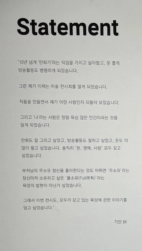 사실 비(非) 사유를 사유하는 것보다 더 사유를 요하는 일은 없을 것입니다. 기안84 전시회의 3가지는 섹션은 순서대로 <의미의 해체>, <불안> , <분열>이자 이를 Statement의 내용과도 엮어 볼 수도 있습니다. 전시회의 큰 주제는 욕망이지만 그 부재 풀 소유(Full所有)가 이 전시회의 완성도를 높이죠. 먼저 모두가 가지고 있는 세속적인 욕망(부동산, 시계, 자동차)은 '불안'으로 이어지기 마련입니다. 이러한 불안에서 벗어나기 위해, 아니 살아남기 위해서 많은 사람들은 생존 수단으로써 '분열'을 택합니다. 분열은 우리를 크게 두 가지, 진지한 얼굴과 웃음기 가득한 얼굴로 나누어 버립니다. 웃음기 가득한 얼굴이 세상의 의미를 해체시켜 버리고, 이것이 진정으로 이 세상에 평화를 가져다준다는 믿음과 함께 말입니다.