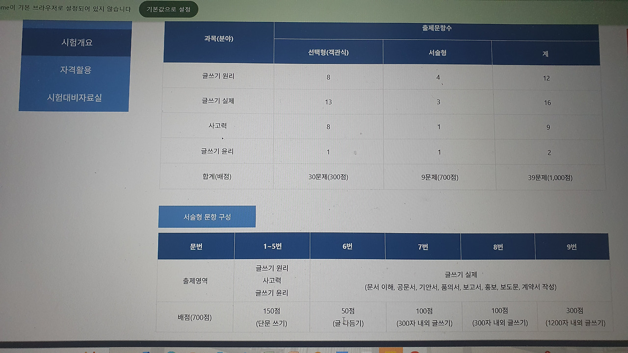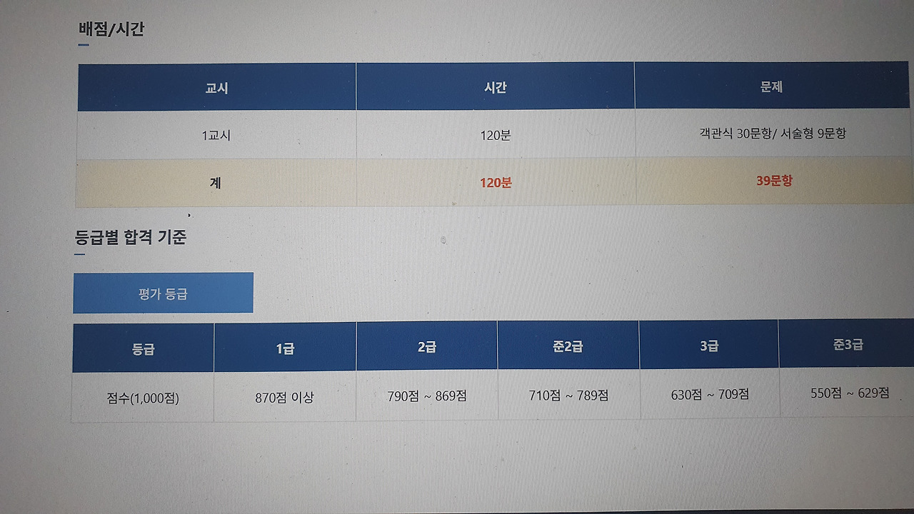 객관식 30문항, 서술형 9문항인데, 객관식이 300점, 서술형이 700점 총 1,000점 만점으로 서술형이 매우 중요한 시험이다. 글쓰기 또한 익숙하지 않은 상황이라 걱정이 한층 더 쌓인다. 노안이 들기 전에 도전하시길 추천드린다.
