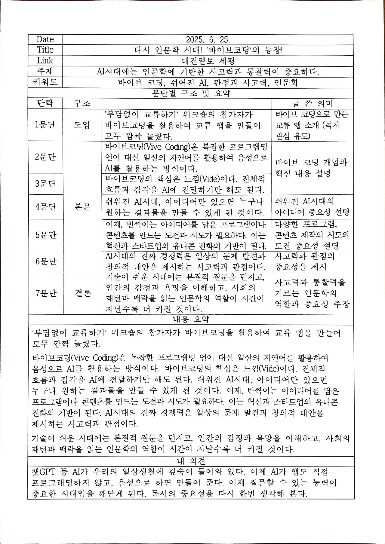 <다시 인문학 시대! '바이브코딩'의 등장!> 신문사설 요약