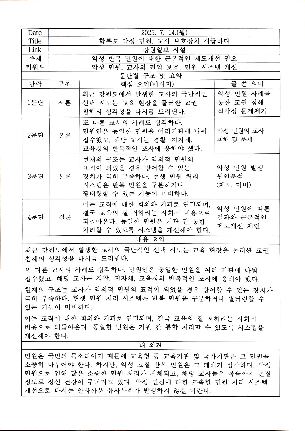 <학부모 악성 민원, 교사 보호장치 시급하다> 사설 요약
