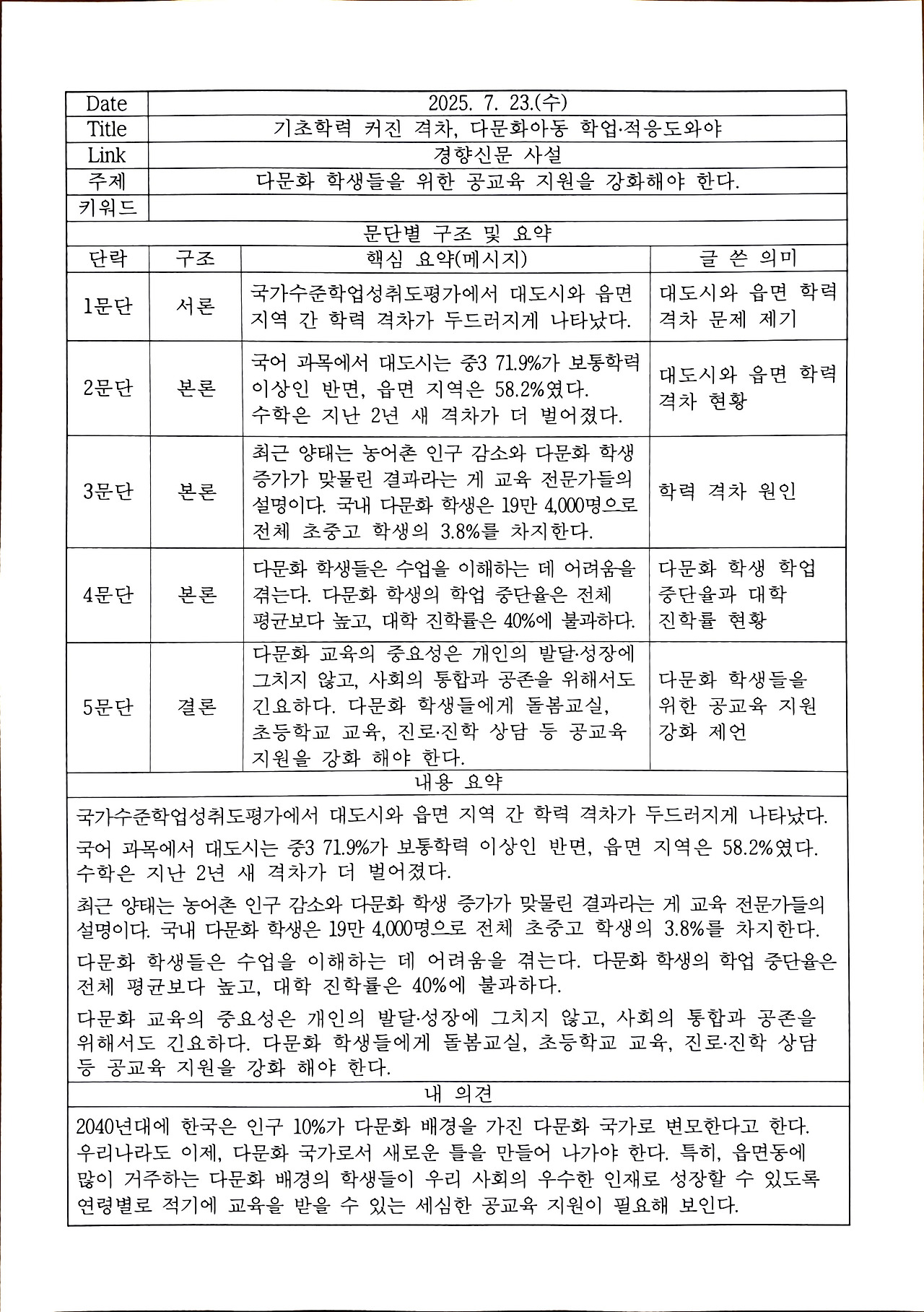 <기초학력 커진 격차, 다문화아동 학업 적응 도와야> 사설 요약