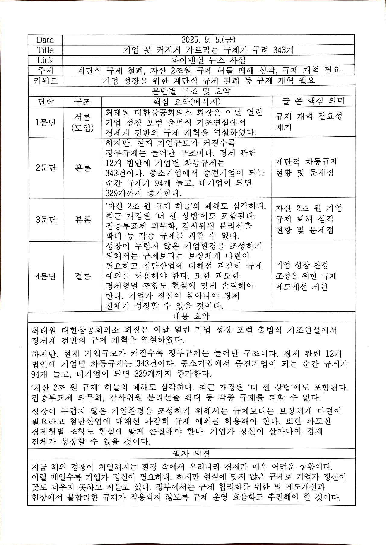 <기업 못 커지게 가로 막는 규제가 무려 343개> 사설 요약