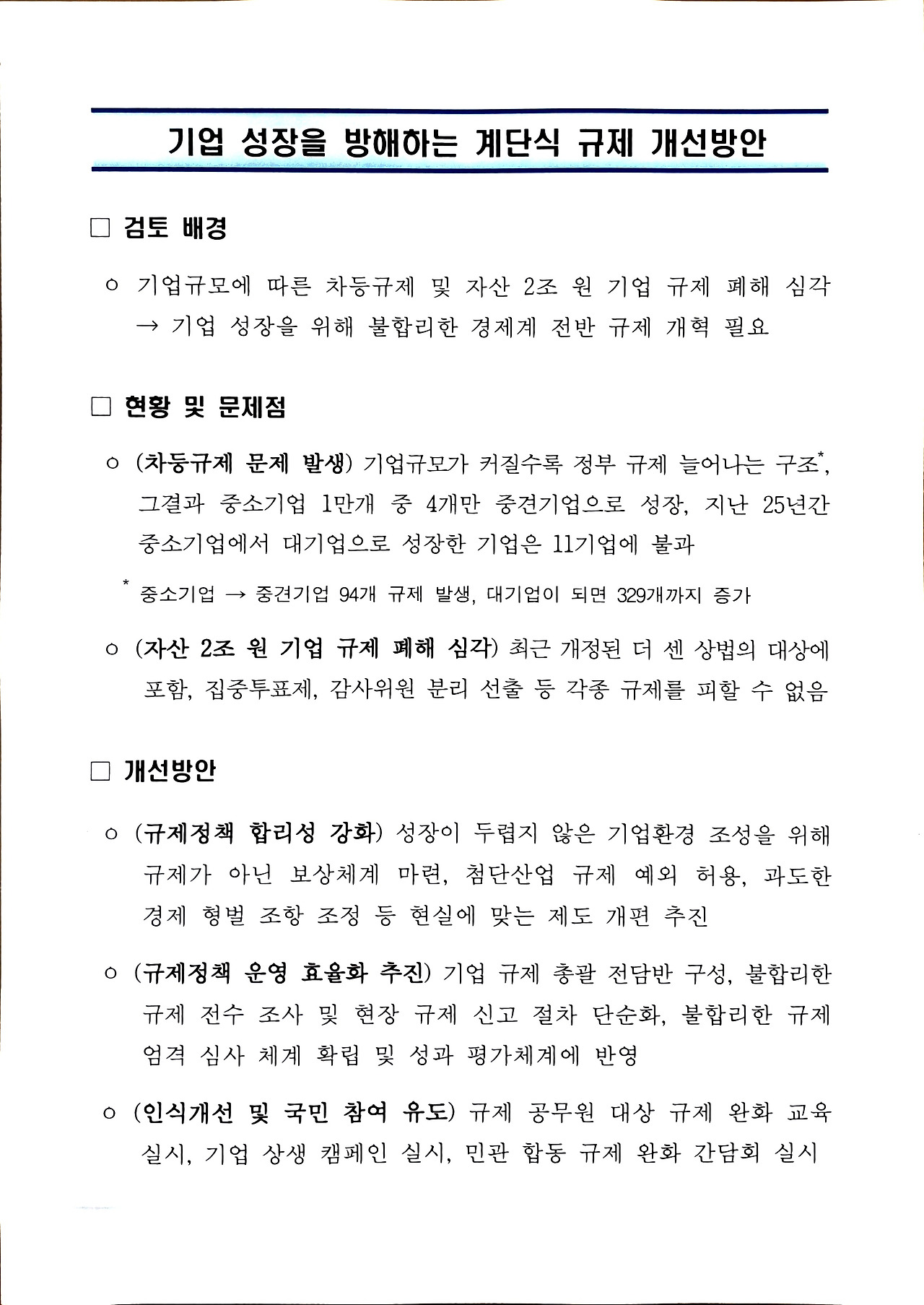 성장이 두렵지 않은 기업환경을 조성하기 위해서는 규제보다는 보상체계 마련이 필요하고 첨단산업에 대해선 과감히 규제 예외를 허용해야 한다. 또한 과도한 경제형벌 조항도 현실에 맞게 손질해야 한다. 기업가 정신이 살아나야 경제 전체가 성장할 수 있을 것이다.