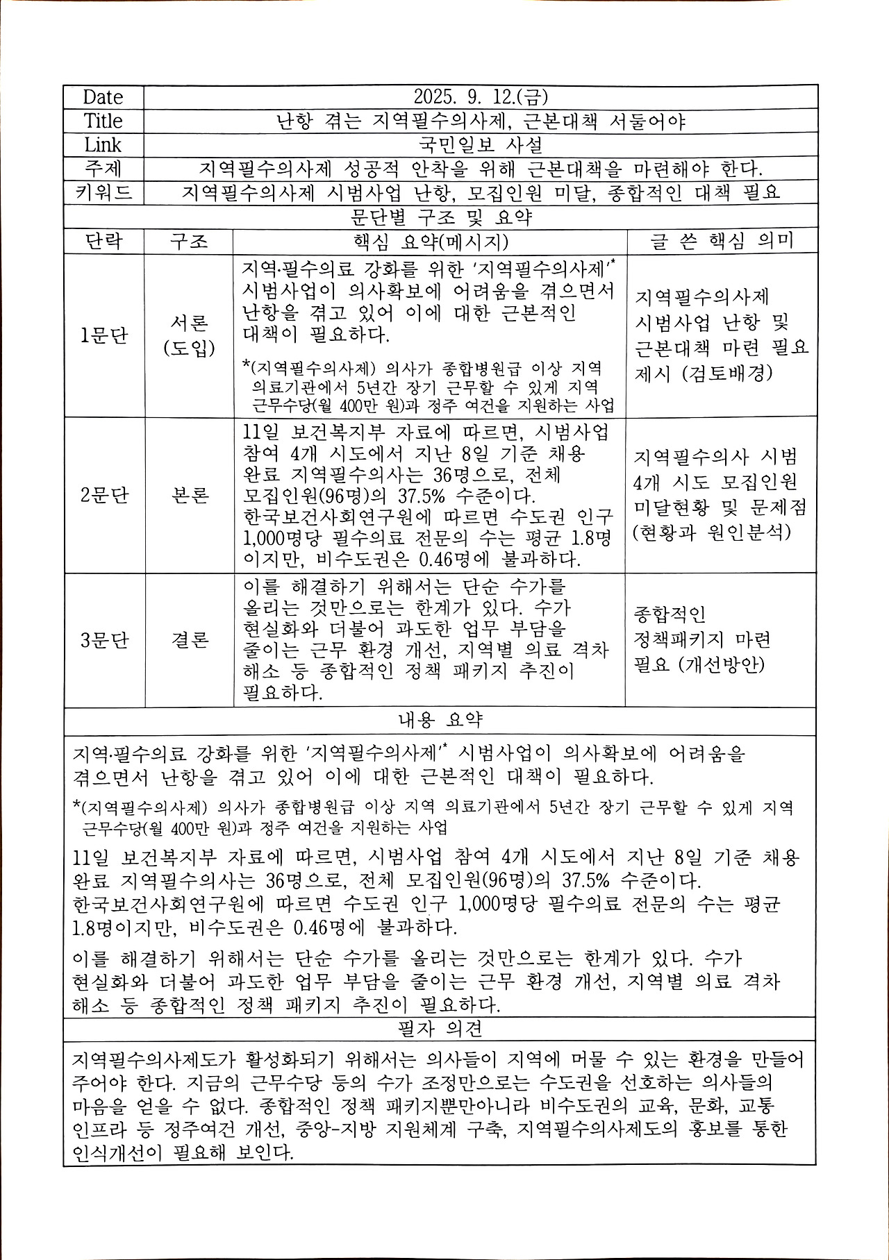 <난항 겪는 지역필수의사제 , 근복대책 서둘러야> 사설 요약