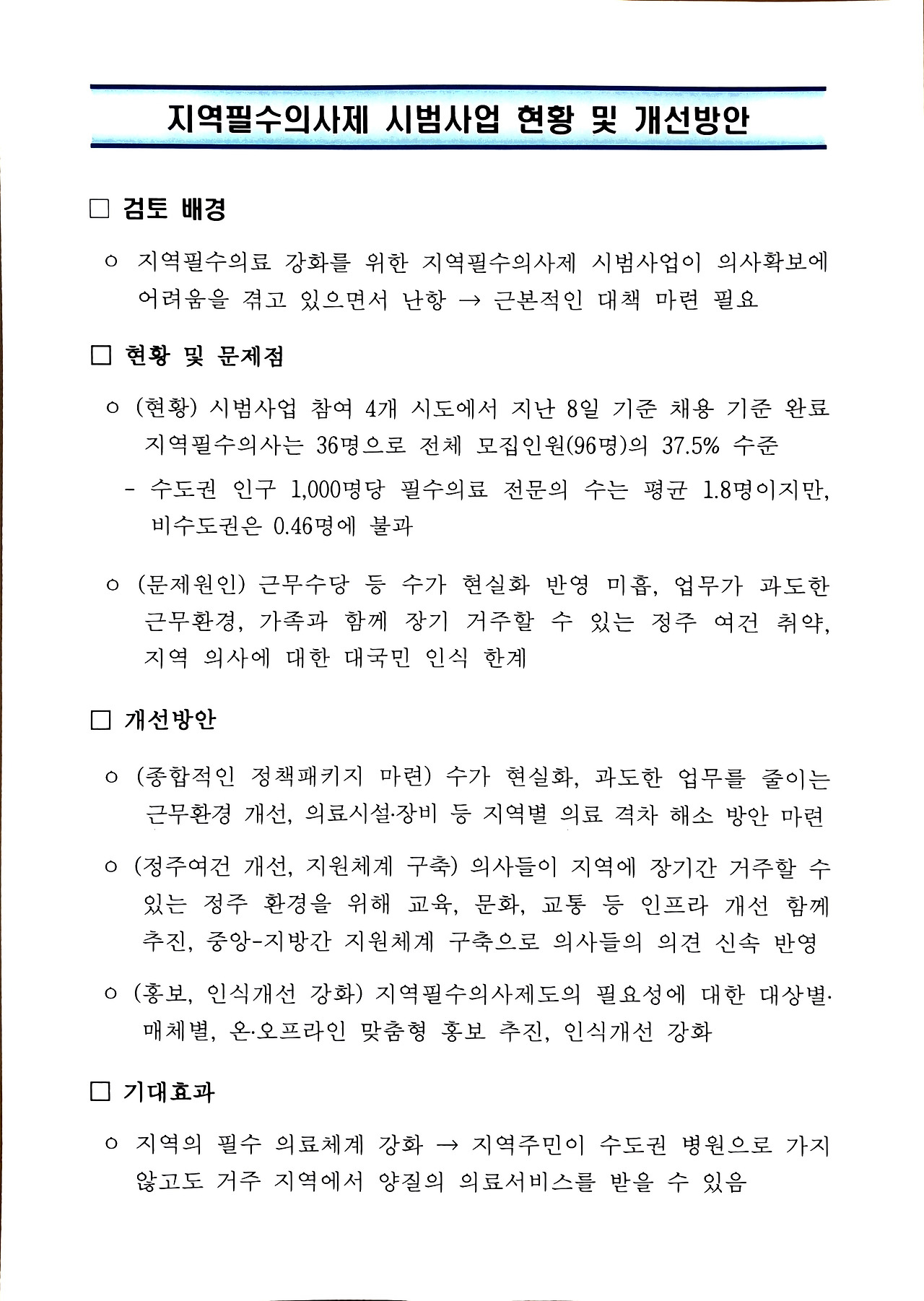 지역․필수의료 강화를 위한 ‘지역필수의사제’* 시범사업이 의사확보에 어려움을 겪으면서 난항을 겪고 있어 이에 대한 근본적인 대책이 필요하다.