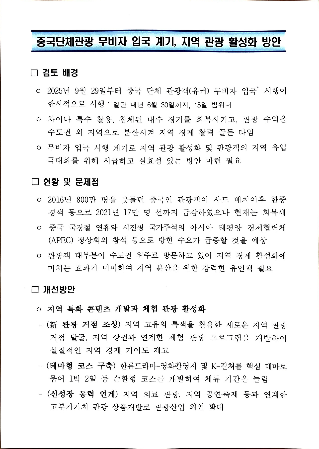 이에, 차이나 특수를 활용하여 침수된 내수 경기를 회복시키고 수도권 외 지역으로 분산시켜 지역경제 활성화를 극대화하기 위해서는 실효성 있는 대책 마련이 필요하다.