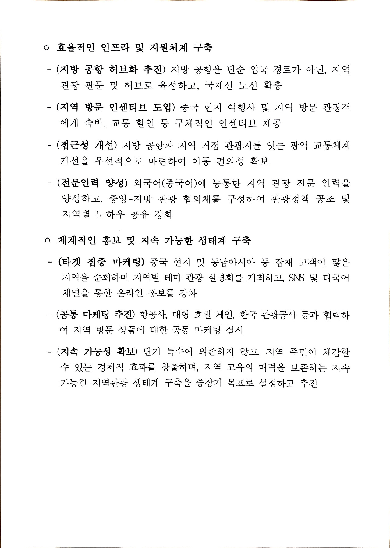 먼저, 지역 특화 콘텐츠 개발과 체험형 관광을 활성화해야 한다. 지역 특화된 새로운 관광 거점 발굴, 체험형 관광프로그램 개발, 한류드라마 등을 활용한 지역 순환 테마형 코스 구축, 지역 의료 등과 연계한 관광상품 등을 개발해야 한다.