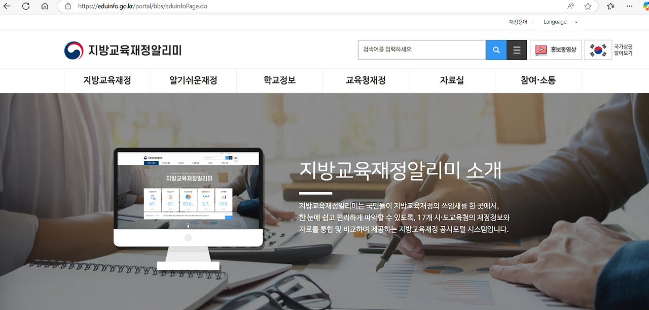 지방교육재정알리미는 국민들이 지방교육재정의 쓰임새를 한 곳에서, 한 눈에 쉽고 편리하게 파악할 수 있도록, 17개 시도 교육청의 재정정보와 자료를 통합 및 비교하여 제공하는 지방교육재정 공시포털 시스템입니다.