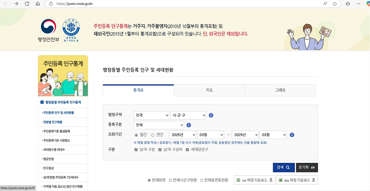 주민등록 인구통계는 거주자, 거주불명자(2010년 10월부터 통계포함) 및 재외국민(2015년 1월부터 통계포함)으로 구성되어 있습니다. 단, 외국인은 제외됩니다.