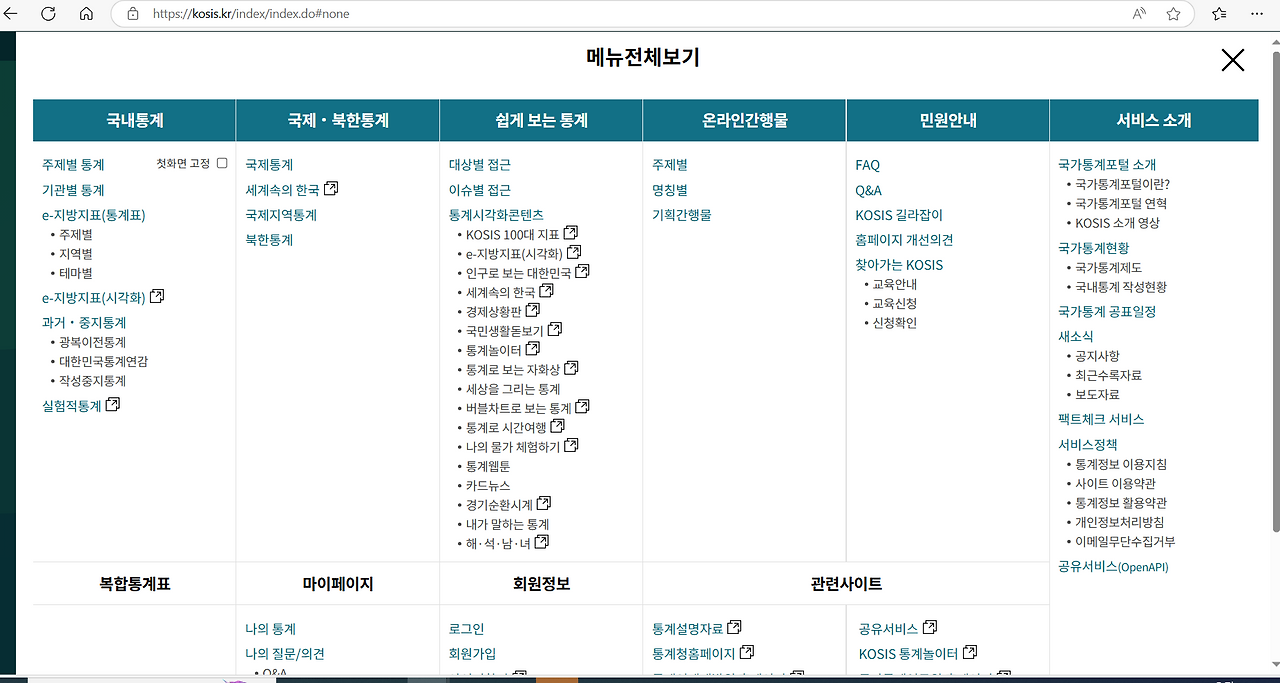국가통계포털(KOSIS, Korean Statistical Information Service)은 국내·국제·북한의 주요 통계를 한 곳에 모아 이용자가 원하는 통계를 한 번에 찾을 수 있도록 통계청이 제공하는 One-Stop 통계 서비스입니다. 현재 400여 개 기관이 작성하는 경제·사회·환경에 관한 모든 국가승인통계를 수록하고 있으며, 국제금융·경제에 관한 IMF, Worldbank, OECD 등의 최신 통계도 제공하고 있습니다. 쉽고 편리한 검색기능, 일반인들도 쉽게 이해할 수 있는 다양한 콘텐츠 및 통계설명자료 서비스를 통해 이용자가 원하는 통계자료를 쉽고 빠르고 정확하게 찾아보실 수 있습니다.
