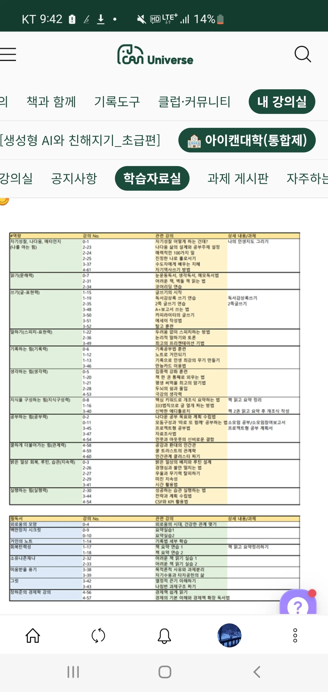 1강부터 순서대로 들을 수도 있었지만, 필자는 아이캔대학에서 안내해 준 아래 자료를 통해 필요한 역량을 맞춤형으로 선택하여 들을 수 있어 우선순위를 정하고 집중하여 들어 더 효과를 경험하였습니다.