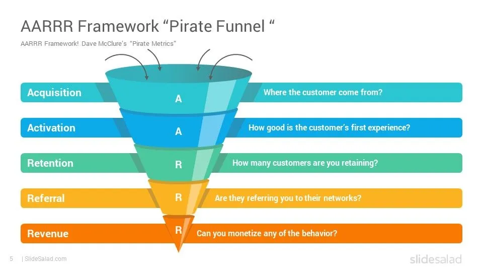 이 프레임워크는 AARRR으로 불리고 미국 스타트업 액셀러레이터인 Dave McClure가 2007년에 처음 세상에 내놓았다. 마지막 단계인 Revenue를 향상하기 위해 Acquisition부터 고객의 행동을 추적하고 분석 및 관리의 효율을 극대화시키기 위해 개발됐다. 물론 어디서부터 어떤 지표를 개선할지 우선순위를 세우고 어디에 영향을 줄지에 대한 로드맵과 함께 최적화시켜야 한다.