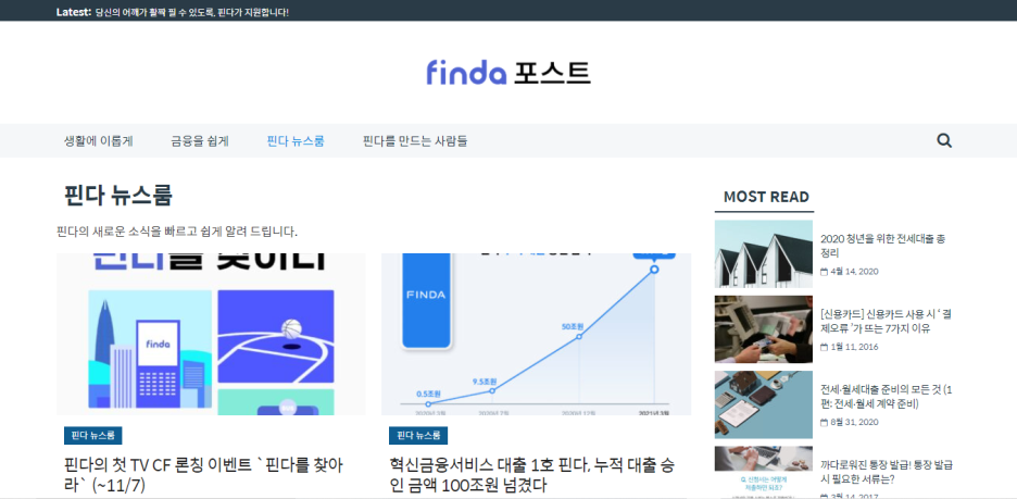 첫 번째 문제로 언급했던 '대출에 대한 막연한 두려움과 해소되지 않는 궁금증'을 해결하기 위해 핀다포스트라는 서비스를 운영하고 있다. '생활에 이롭게', '금융을 쉽게' 총 2개 카테고리로 나눠 콘텐츠를 업로드하고 있으며 나머지 카테고리에서는 핀다 관련 뉴스와 핀다 내부 콘텐츠를 생산하고 있다.