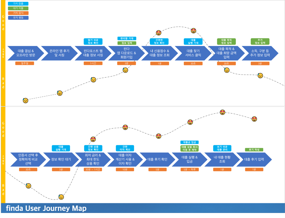 위 자료를 봤을 때 오프라인 금융기관 방문으로 인해 몇 날 며칠을 발품 팔아야 하는 페인포인트가 있다. 이 과정에 개인 정보 증빙을 위한 서류 구비에 대한 어려움이라는 페인포인트도 함께 있다. 핀다는 이 단계를 앱과 웹 서비스를 통해 대출을 위한 발품을 파는 과정을 줄이고 증빙 서류를 공동인증서로 해결하고 있다. 플랫폼 안에서 고객이 대출을 실행하려고 할 때 오프라인과 비교했을 때 상대적으로 굉장히 짧은 시간이지만 대출 목적, 대출 희망 금액, 추가 정보 입력, 인증서 로그인 등의 가치 잠식 구간이 있다. 이 프로세스는 가장 합리적인 단계로 이뤄져 있다고 생각되지만 이 단계 안에서 주요 타겟 고객인 '신용 거래 내역이 없는 씬파일러'를 위해 중간중간에 용어 해설에 대해 확인할 수 있는 기능이 추가된다면 고객이 대출의 실행을 결정하는데 소요되는 시간을 줄여줄 수 있는 긍정적인 요인으로 작용할 것이다.