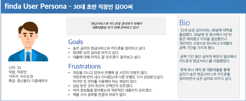위 핀다가 공개한 보도자료와 이혜민 공동대표의 인터뷰를 토대로 유추해보는 주요 타겟 퍼소나는 시중은행의 대출 거절로 인해제 2금융권에서 대출을 실행하는 중신용자 3040세대이며 더 좁히면 가장 비율이 높은 30대 남성으로 볼 수 있다.