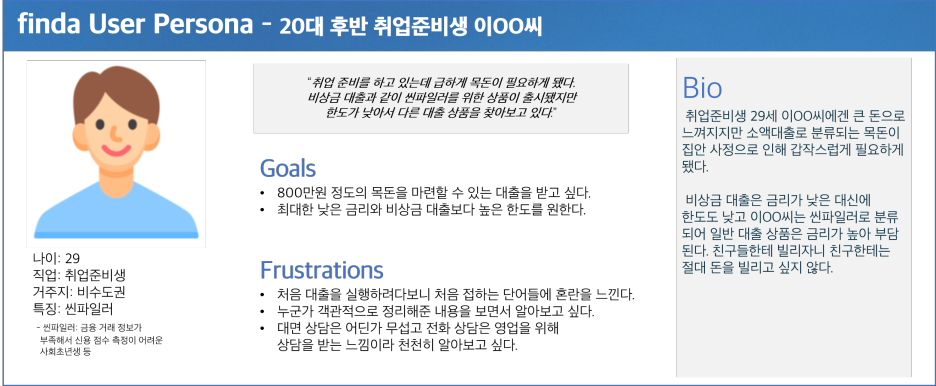 위 보도자료와 이혜민 공동대표의 인터뷰, 신용정보원의 보고서를 토대로 주요 고객이 될 수 있는 퍼소나를 분석해보면 2030세대 씬파일러와 3040세대 중신용자 저축은행 소액 대출을 주로 이용하는 다중 채무자다.