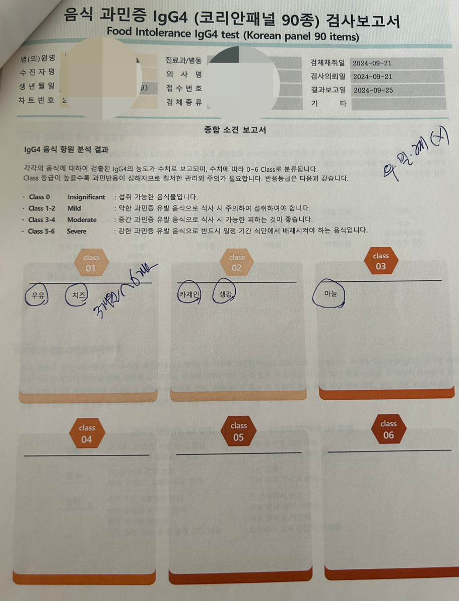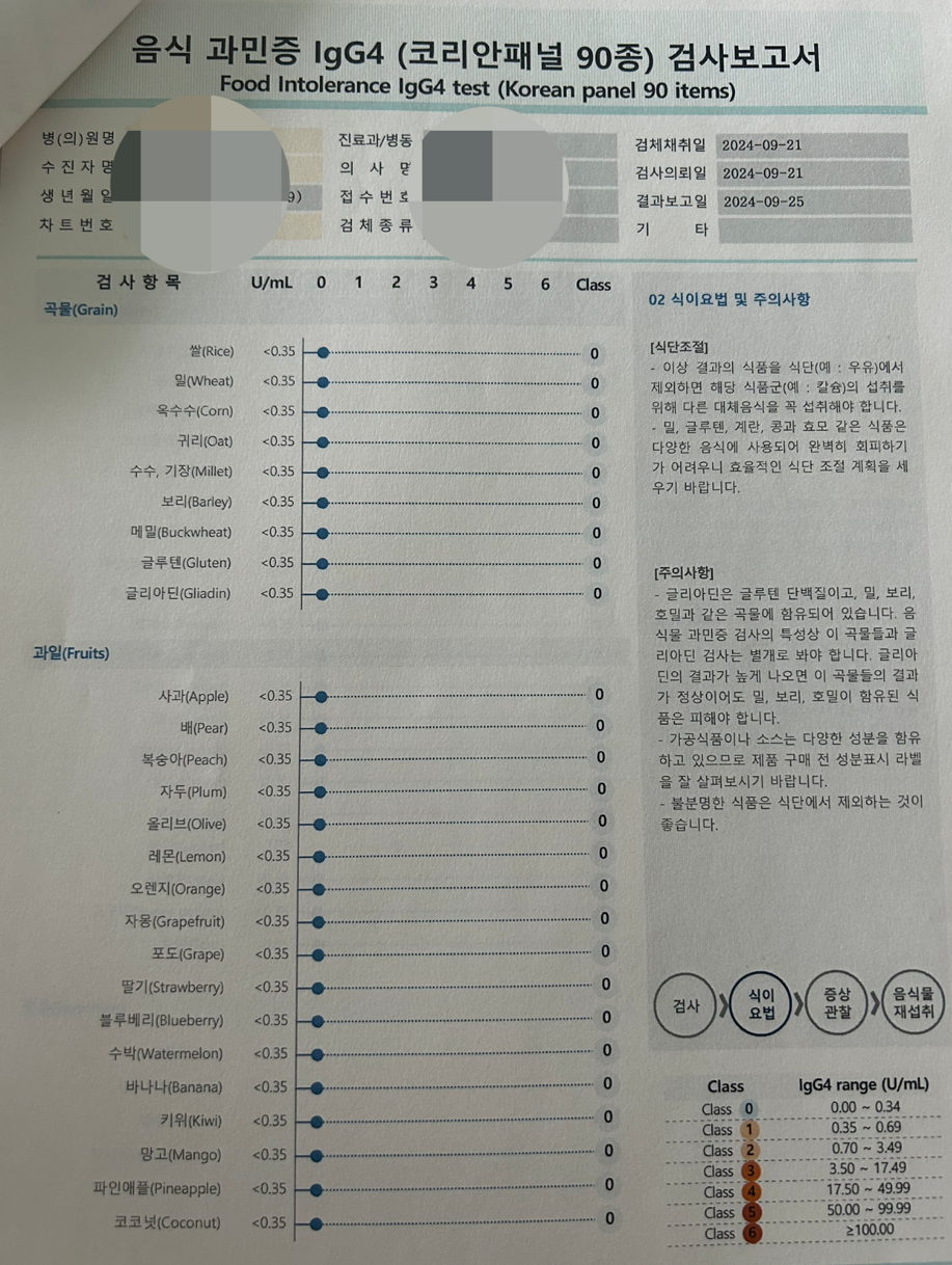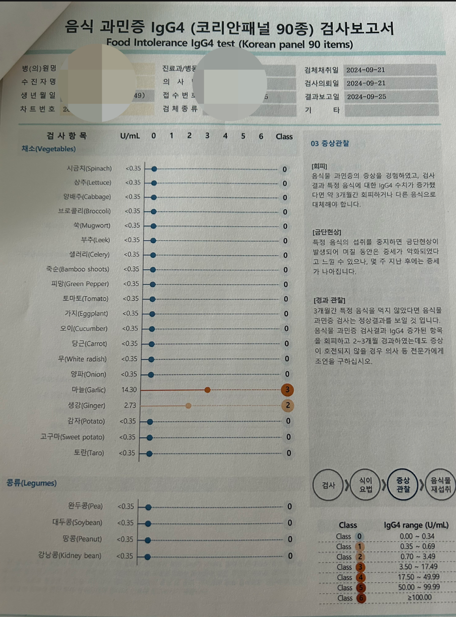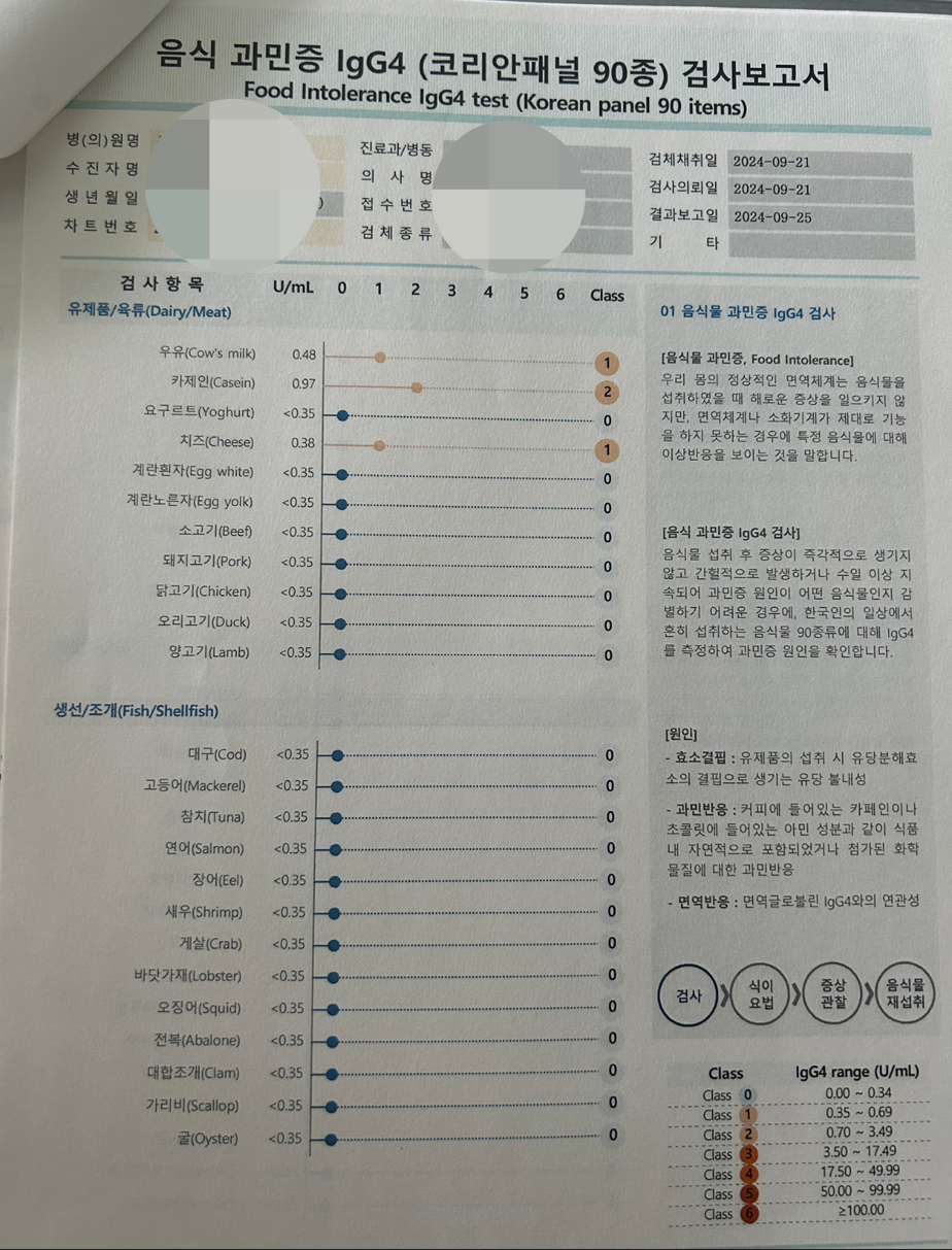 과민반응이 있는 음식이 5가지 나왔는데, 우유와 치즈, 카제인은 원래 먹지 않으니 괜찮았다. 생강도 김치를 담글 때 아주 조금 넣는 정도라 큰 문제는 없었다.