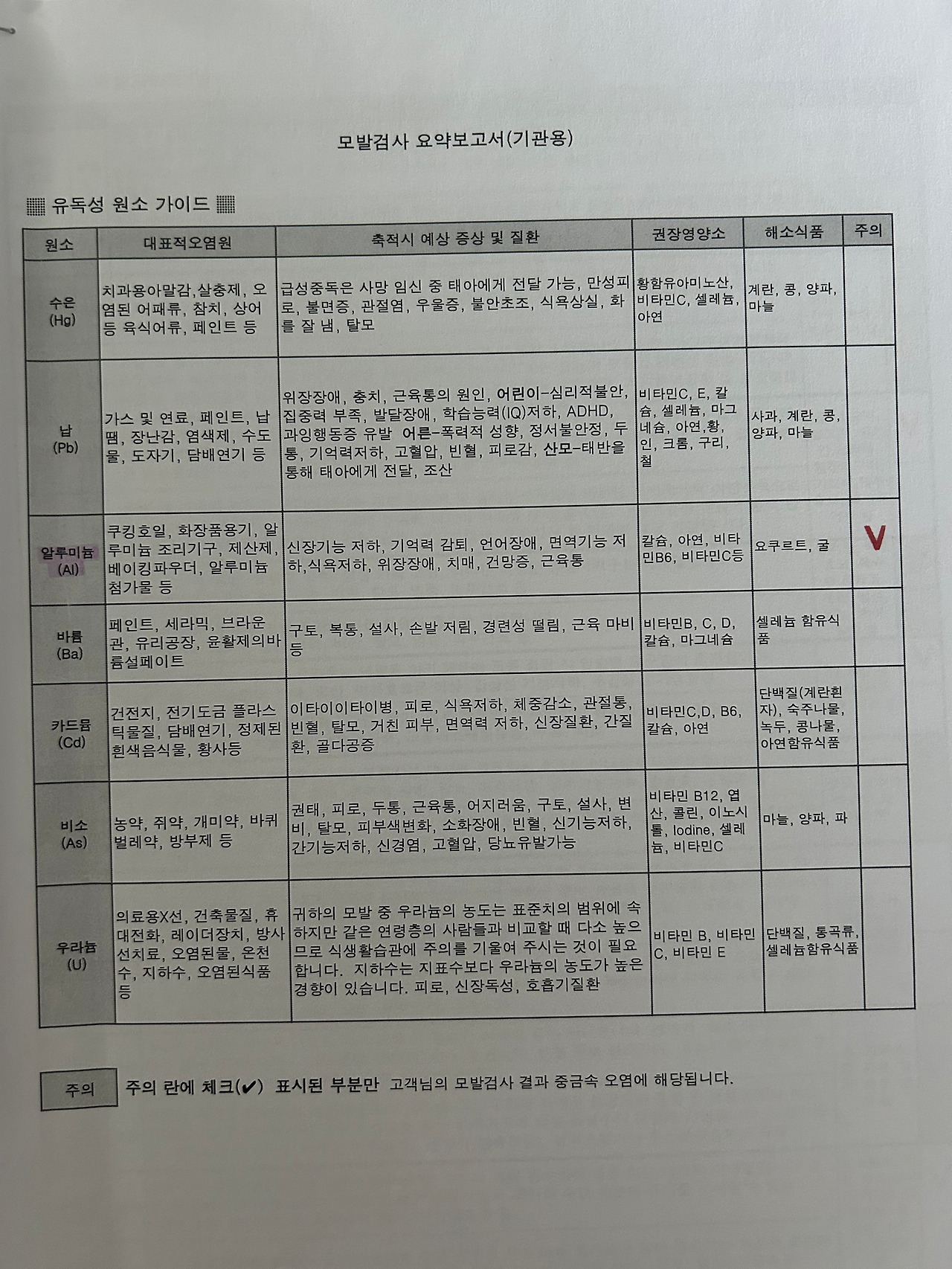 -검사 항목: 철분, 칼슘, 마그네슘, 셀레늄 등 우리 몸에 필요한 미네랄 측정과 납, 카드뮴, 수은, 알루미늄과 같은 중금속 측정