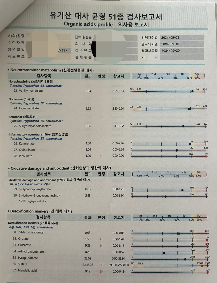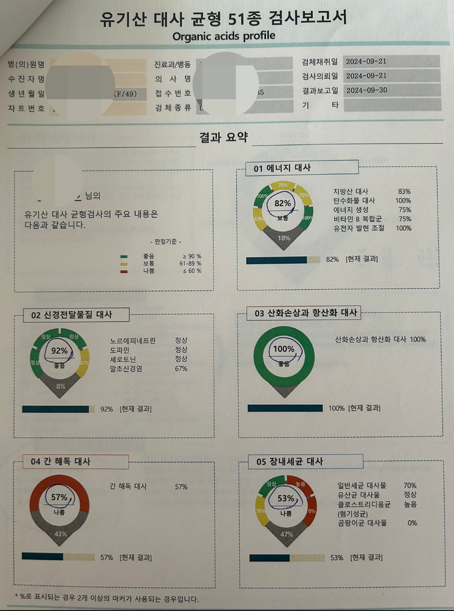 -검사 항목: 에너지 대사, 신경전달물질대사, 산화손상과 항산화 대사, 간 해독 대사, 장내 세균 대사