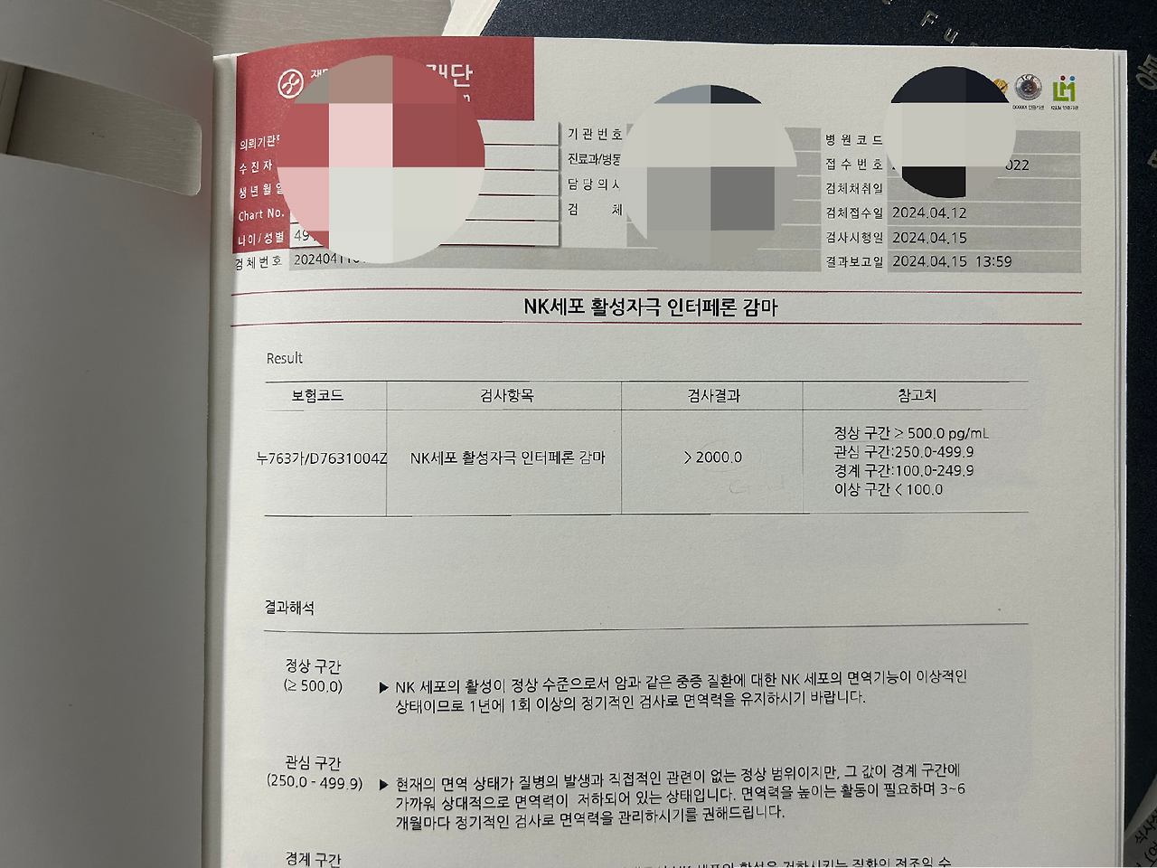 불과 이틀 전까지 항암과 방사선 치료를 받고 있었는데도, 검사 결과는 놀랍게도 정상 수준 이상이었다. 당시 나는 면역 관련 수치에 특히 예민해 있었고,