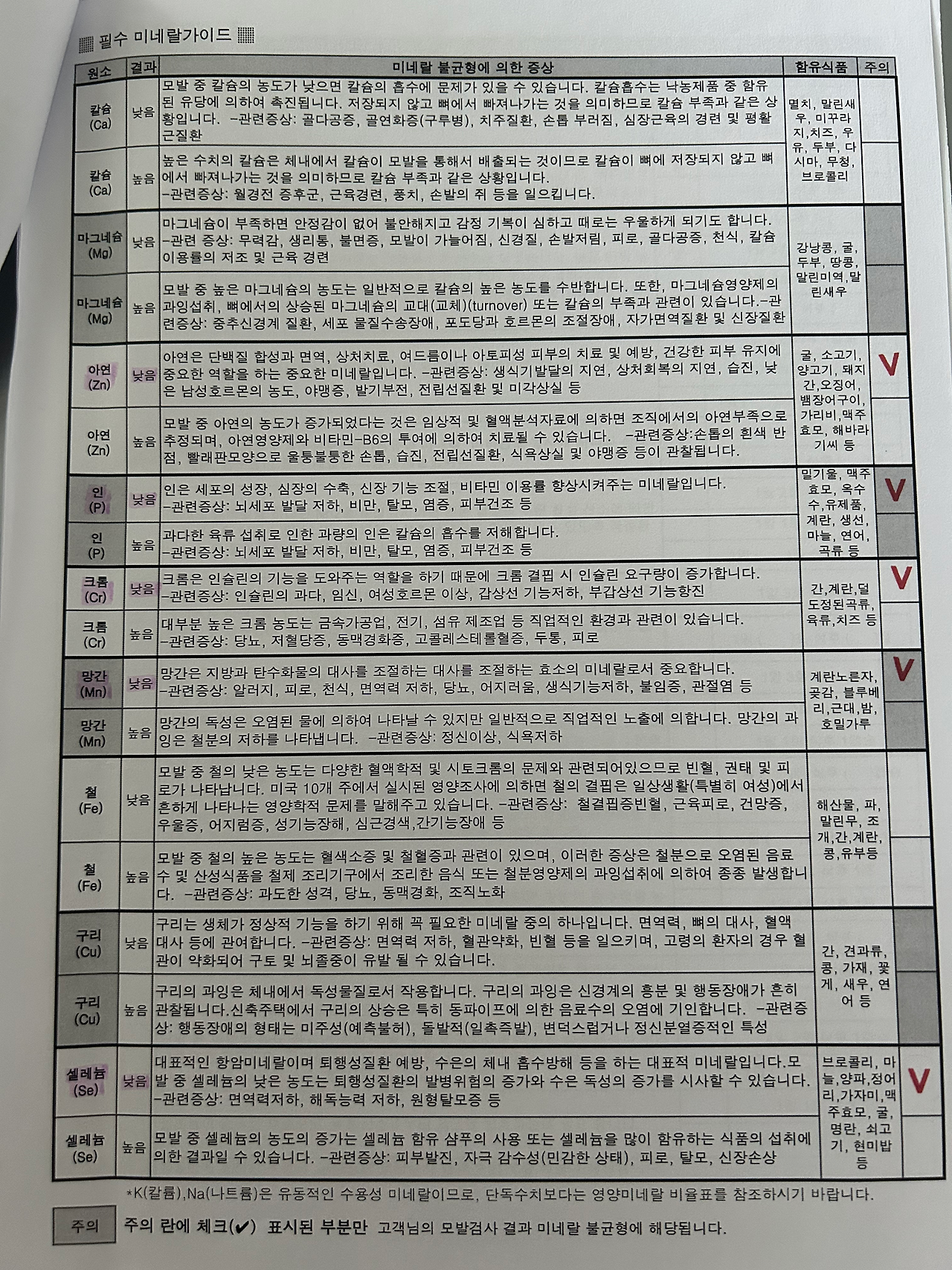 자세히 들여다보니 부족한 미네랄들은 대부분 멀티비타민 영양제에 포함된 성분들이었다. 암 진단 이전에는 영양제를 거의 챙겨 먹지 않았기에, 음식만으로는 모든 영양소를 충분히 채우기 어렵다는 사실을 그제야 실감했다.
