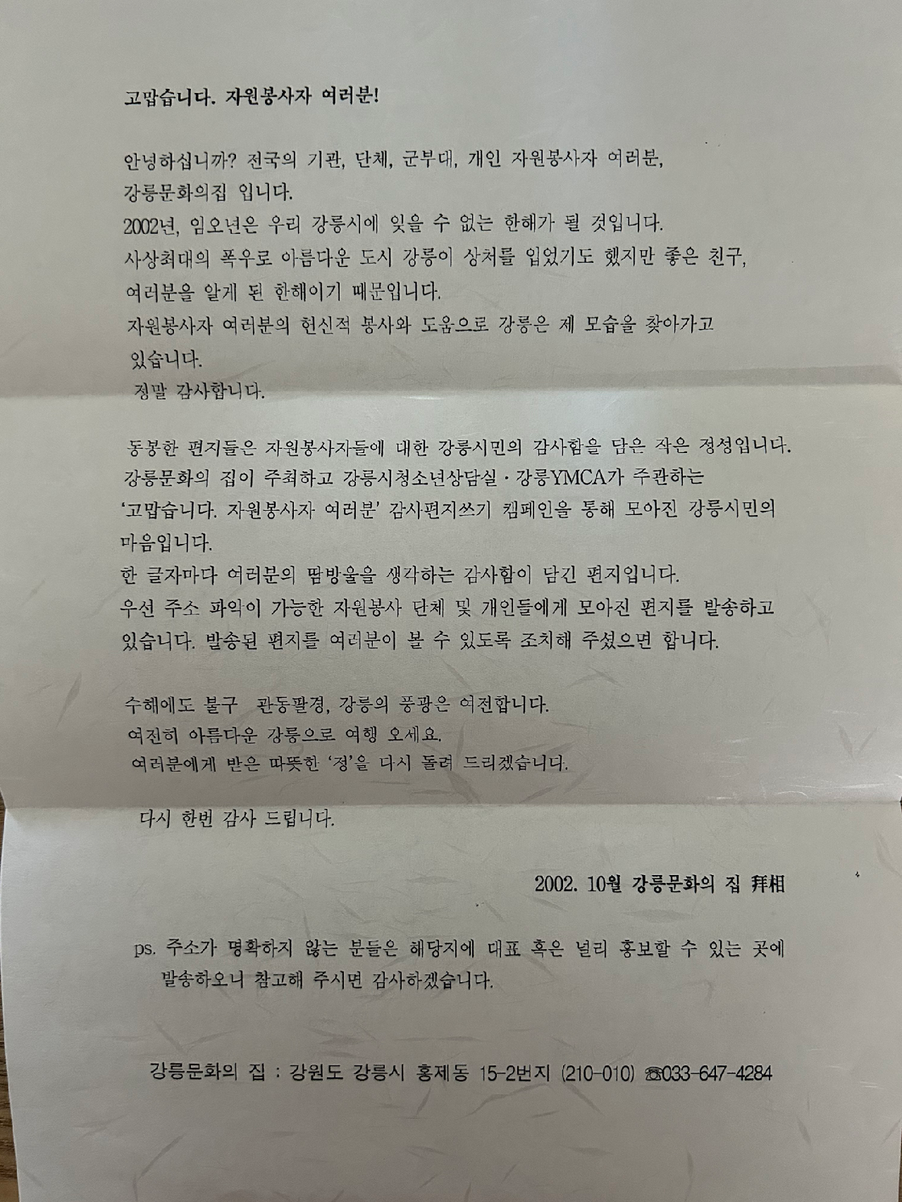 얼마 전, 중학교 시절부터 모아둔 편지함을 뒤적이다가 익숙지 않은 봉투 하나를 발견했다. 2002년 10월, 강릉자원봉사센터에서 온 감사 편지와 학생들이 함께 전해준 손편지였다.