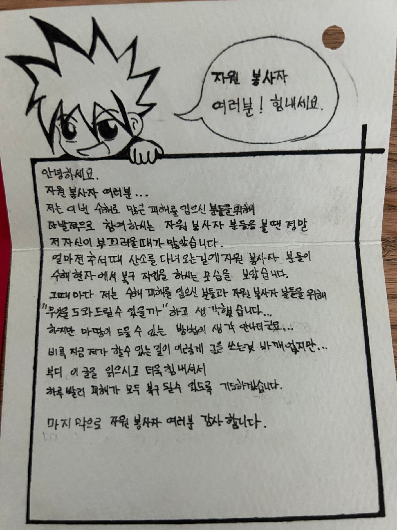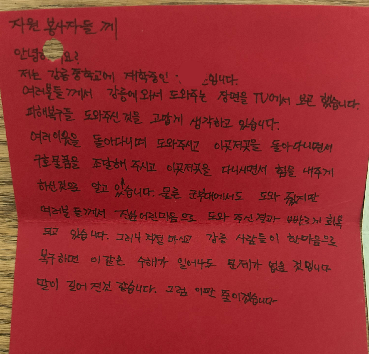 엄마께는 사실대로 말씀드렸다. 시골에서 농사짓는 부모님을 떠올리며 피해 주민들에게 조금이라도 힘이 되길 바라는 마음으로 다녀왔다고.