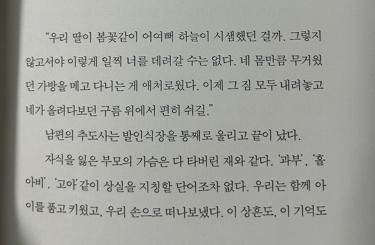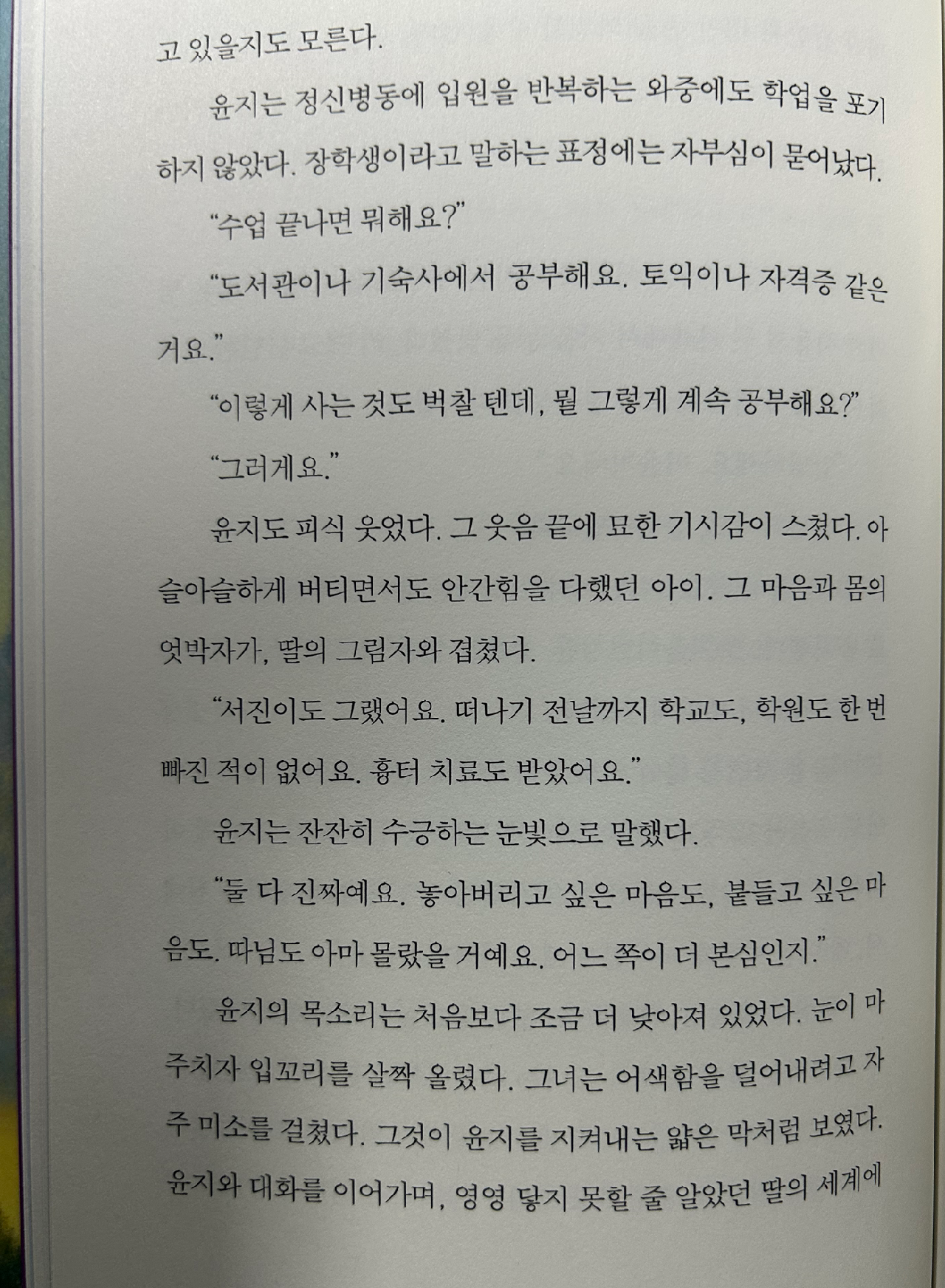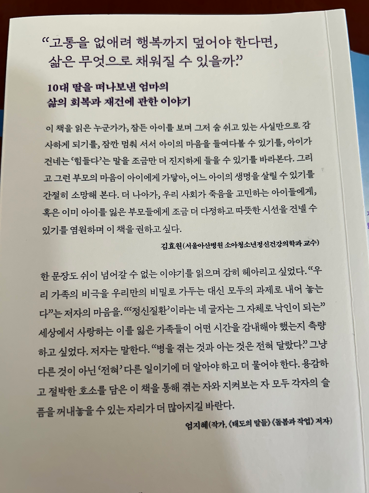 떠나간 딸을 이해하고 또한 살아내기 위해 글을 쓴 작가님의 마음은 숨이 막힐 정도로 절실하면서도 동시에 차분하게 글을 풀어내는 힘이 느껴졌다.