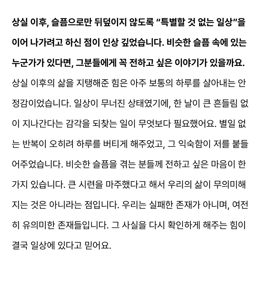 죽음과 애도, 상실을 다룬 책들을 찾아 읽었지만 대부분 다른 문화권의 정서와 맥락에 기대고 있었고, 우리 현실을 담은 부모의 기록은 좀처럼 만나기 어려웠습니다. 그 결핍을 마주하며 누군가는 이런 이야기를 저처럼 필요로 할지 모른다는 생각이 들었고,