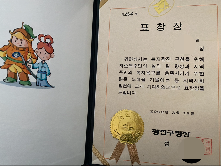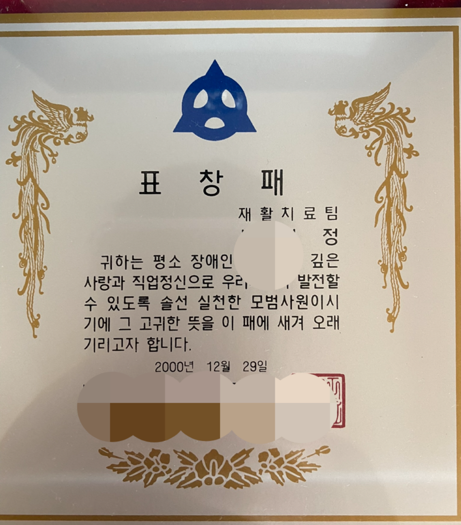 “직원들이나 이용자들 사이에서 선생님을 칭찬하는 얘기를 많이 들었어요. 내가 기분이 참 좋더라고요. 여러모로 고맙고 칭찬해주고 싶어서 표창패를 주려고 해요. 우리 복지관 개관이래(1975년 개관) 처음 만든 상이라 의미가 큽니다."