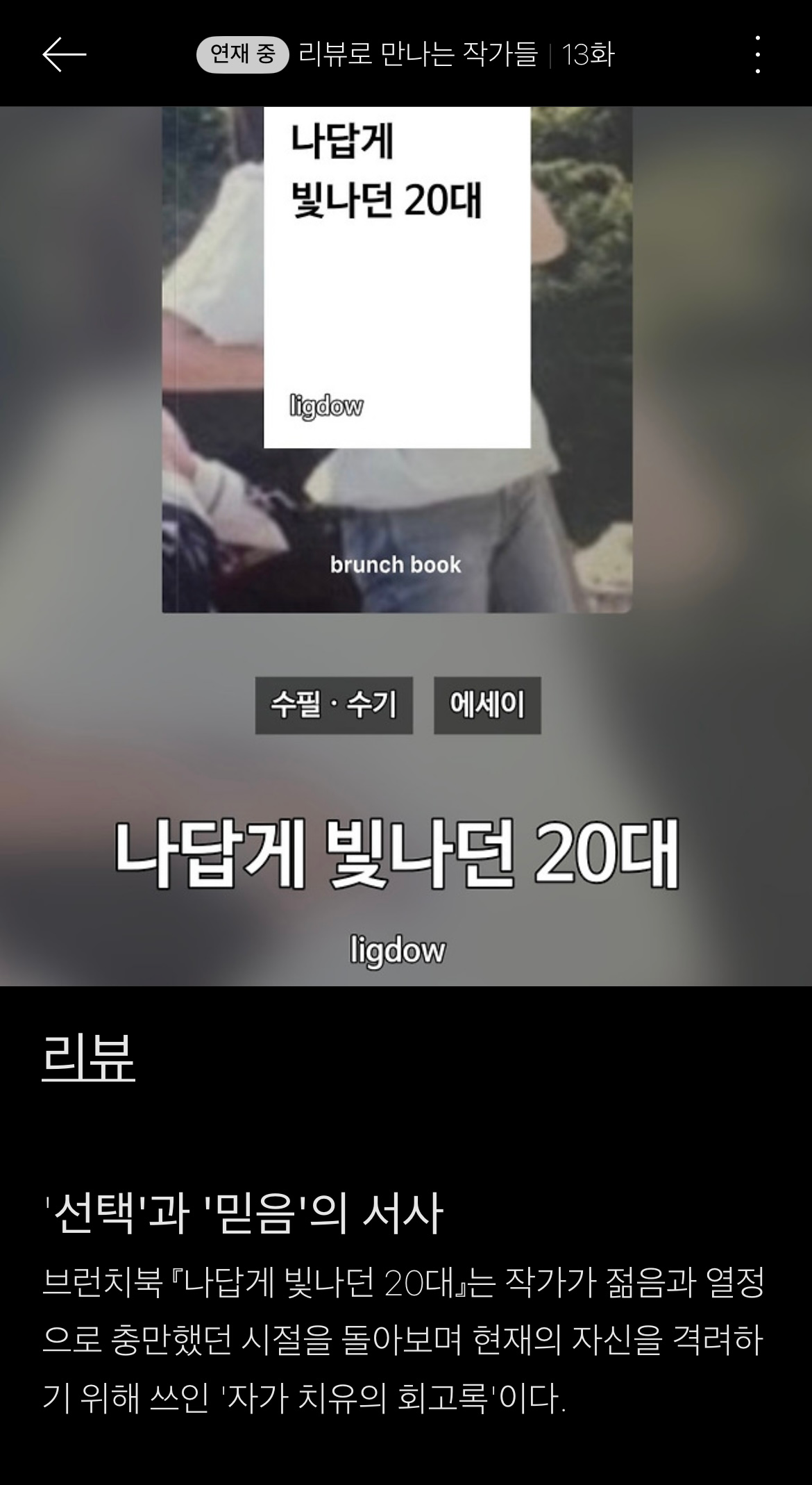 제가 브런치북 리뷰로 만나는 작가들 발행 중입니다. 작가님의 브런치북 한 화를 리뷰하고,