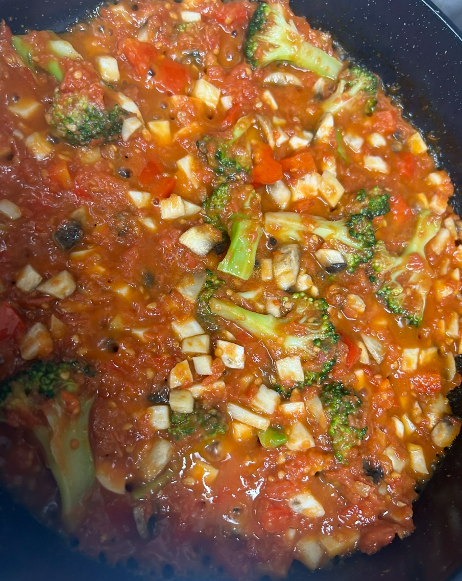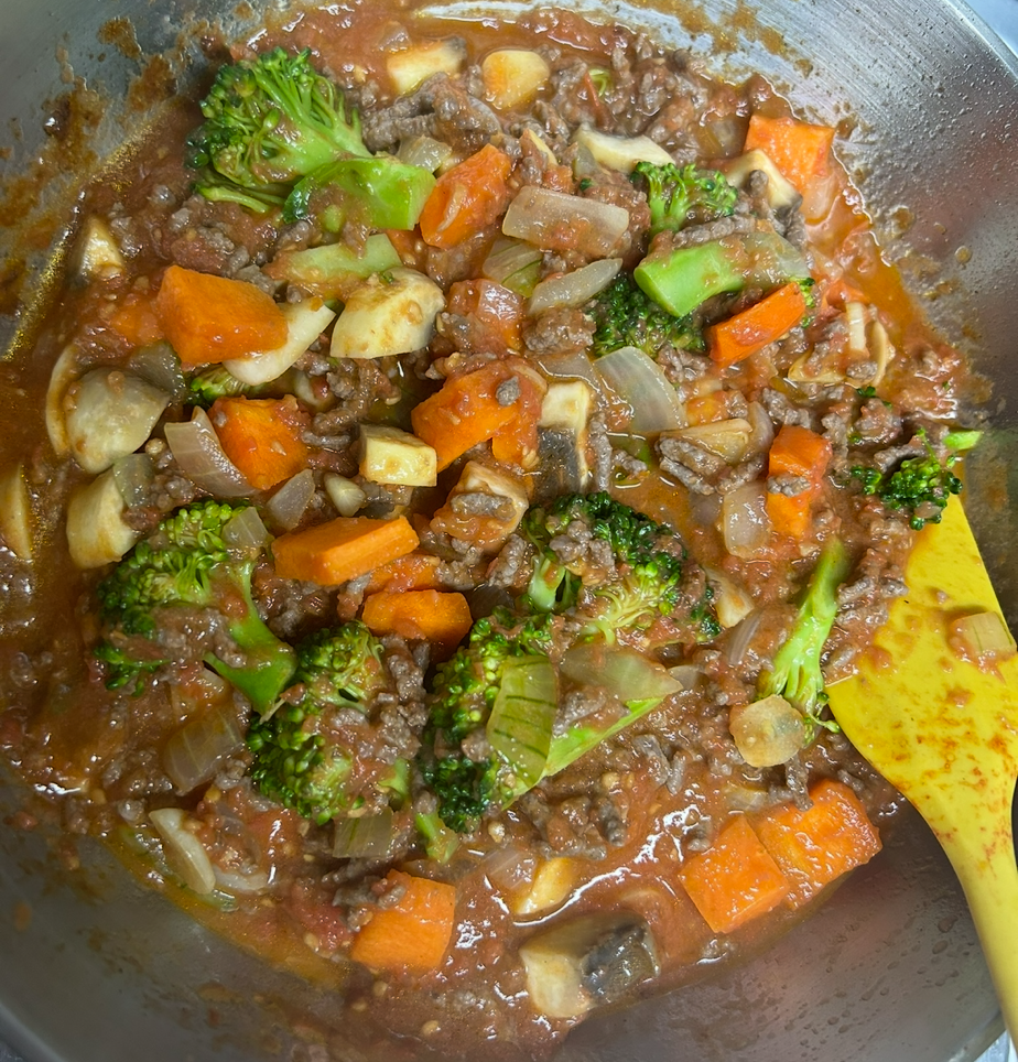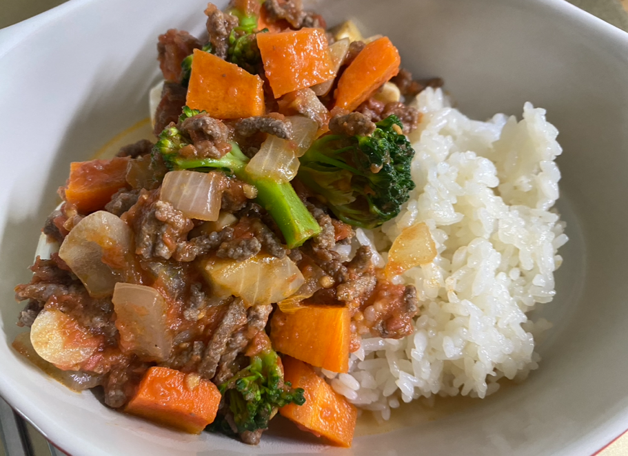 -고기와 여러 채소를 볶다가 토마토퓌레(직접 끓여서 준비해 둔 것)를 부어 한번 끓인다. 거기에 브로콜리를 넣어주고 연두부나 양배추 혹은 밥 위에 올려 먹는다.