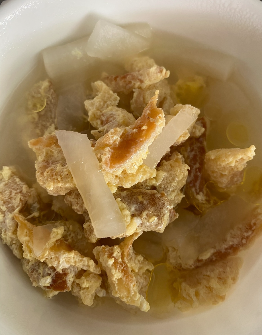 무와 콩나물, 그리고 미역을 황태와 함께 넣어 국을 끓인다. 황태뭇국과 황태콩나물국에는 황태에 달걀옷을 입힌다. 원래 국에 들어간 황태의 식감은 살짝 거친 편인데, 달걀을 입히면 이게 정말 황태가 맞나 싶을 만큼 부드러워진다. 이렇게 먹고 나니 그냥 끓인 황탯국은 왠지 매력이 없다. 국으로 끓이지 않을 때는 간식으로 황태채를 한 줌씩 집어 먹기도 한다.